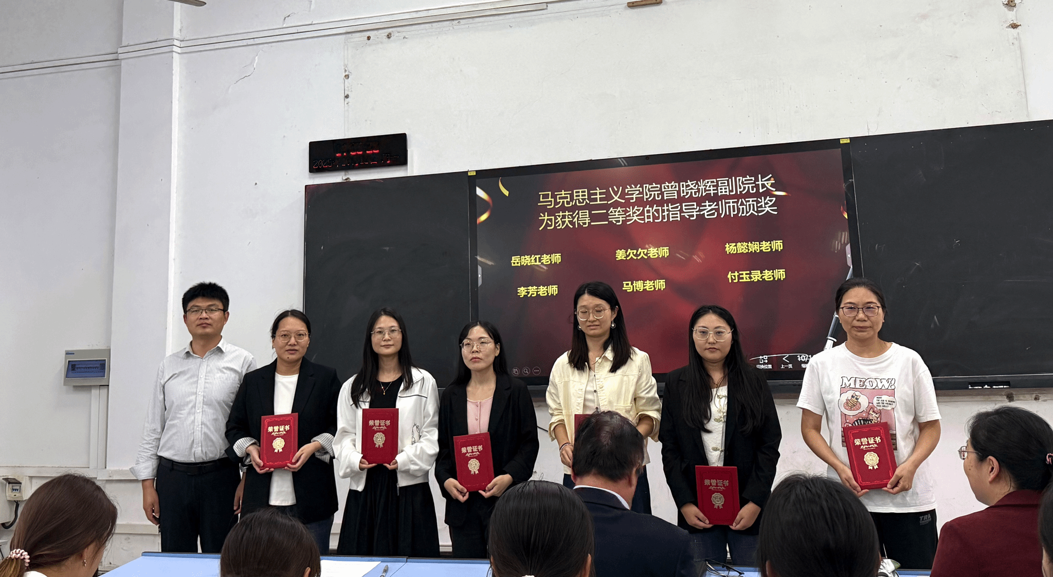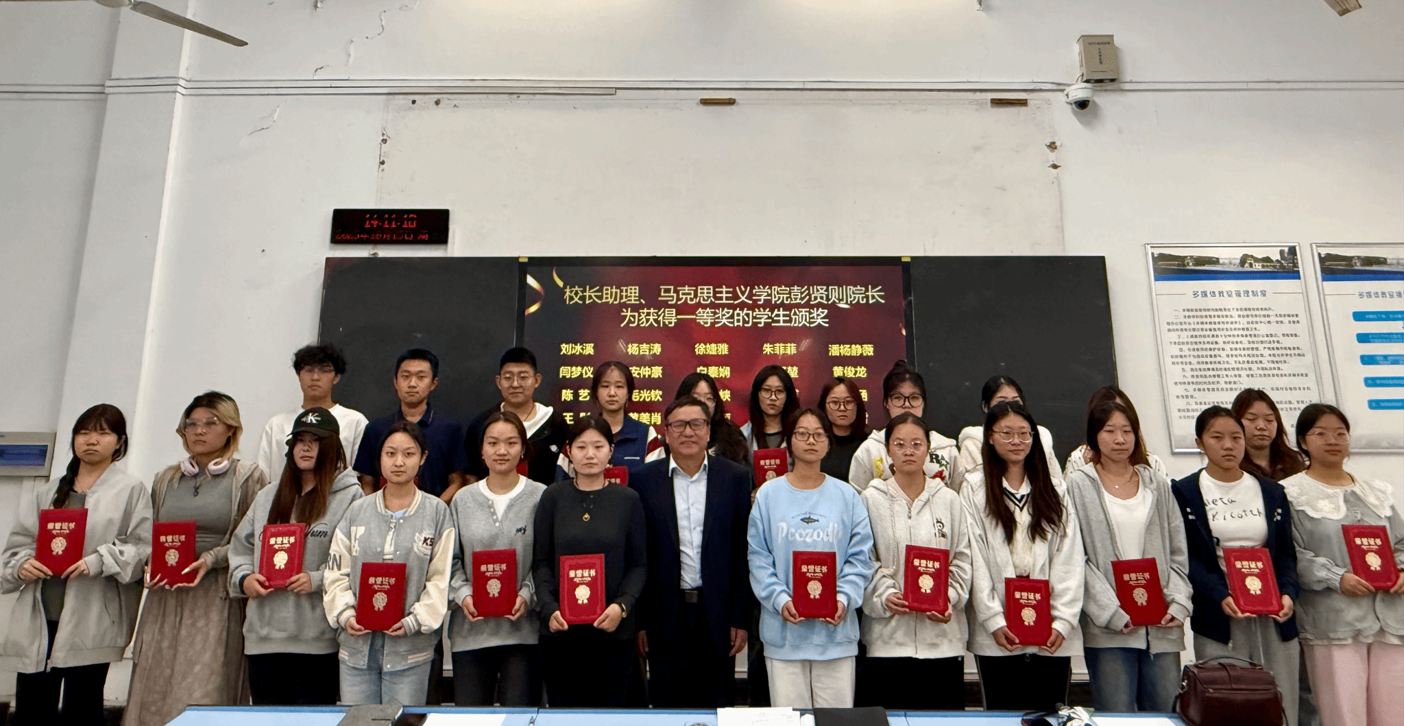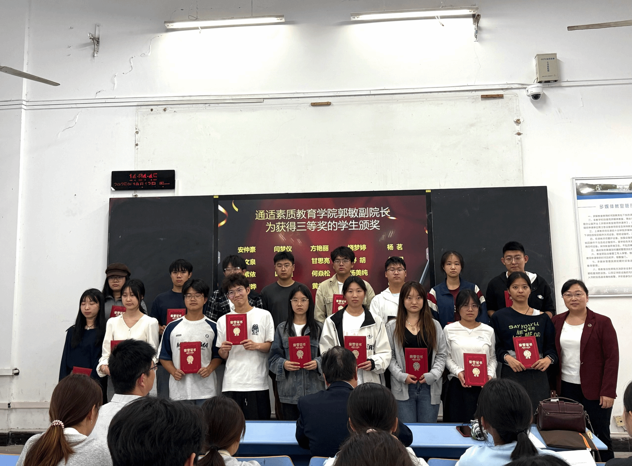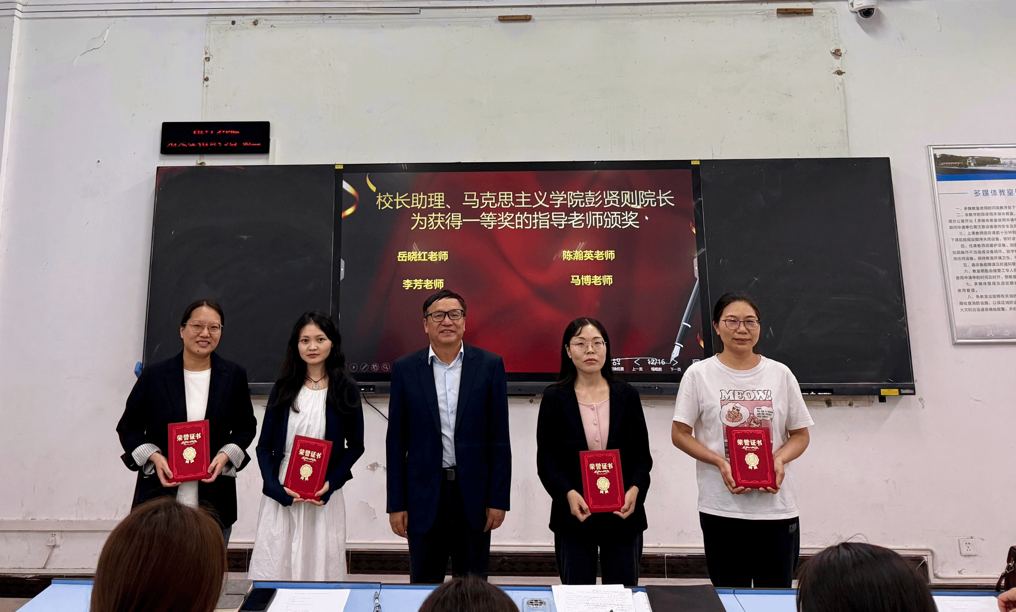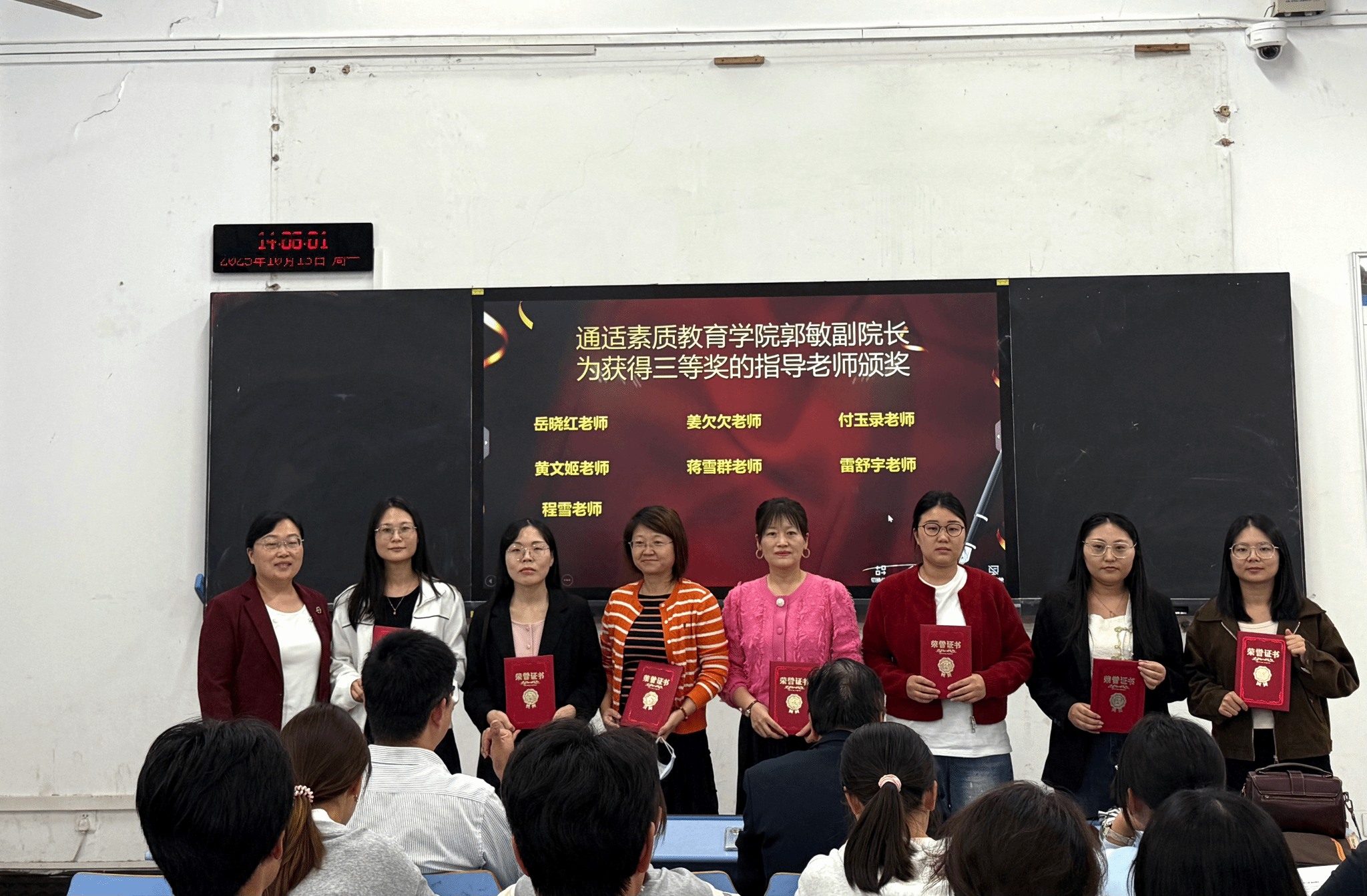 彭贤则校长助理、曾晓辉副院长、郭敏副院长分别为获得一、二、三等奖的学生及指导教师颁发荣誉证书和奖品,并合影留念。现场气氛热烈,掌声不断。
