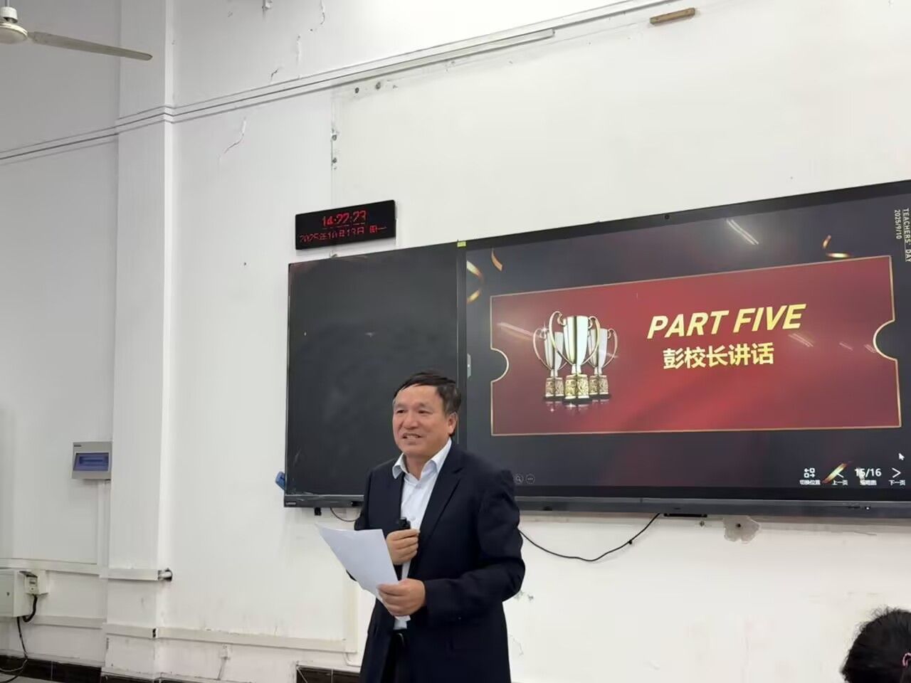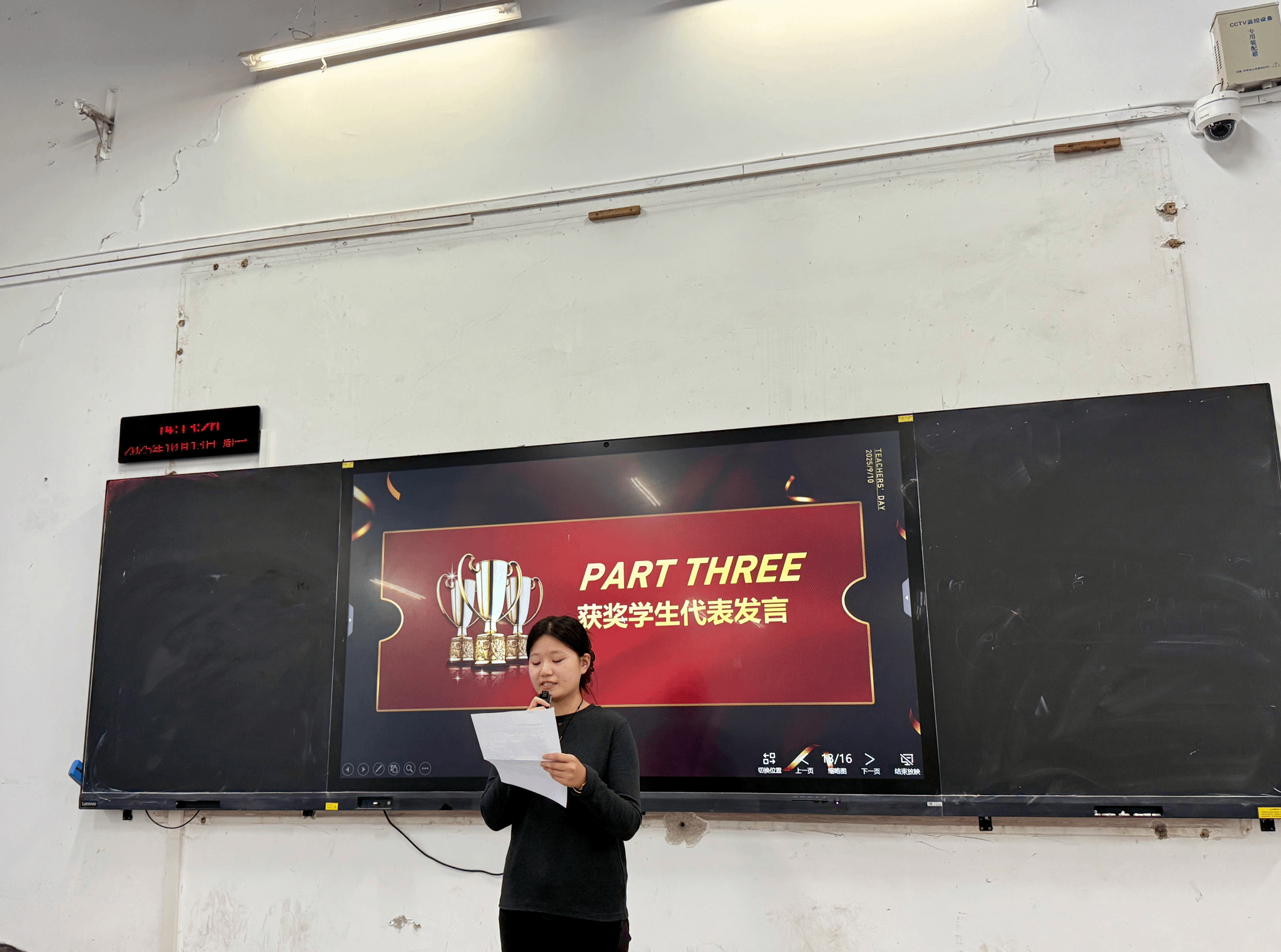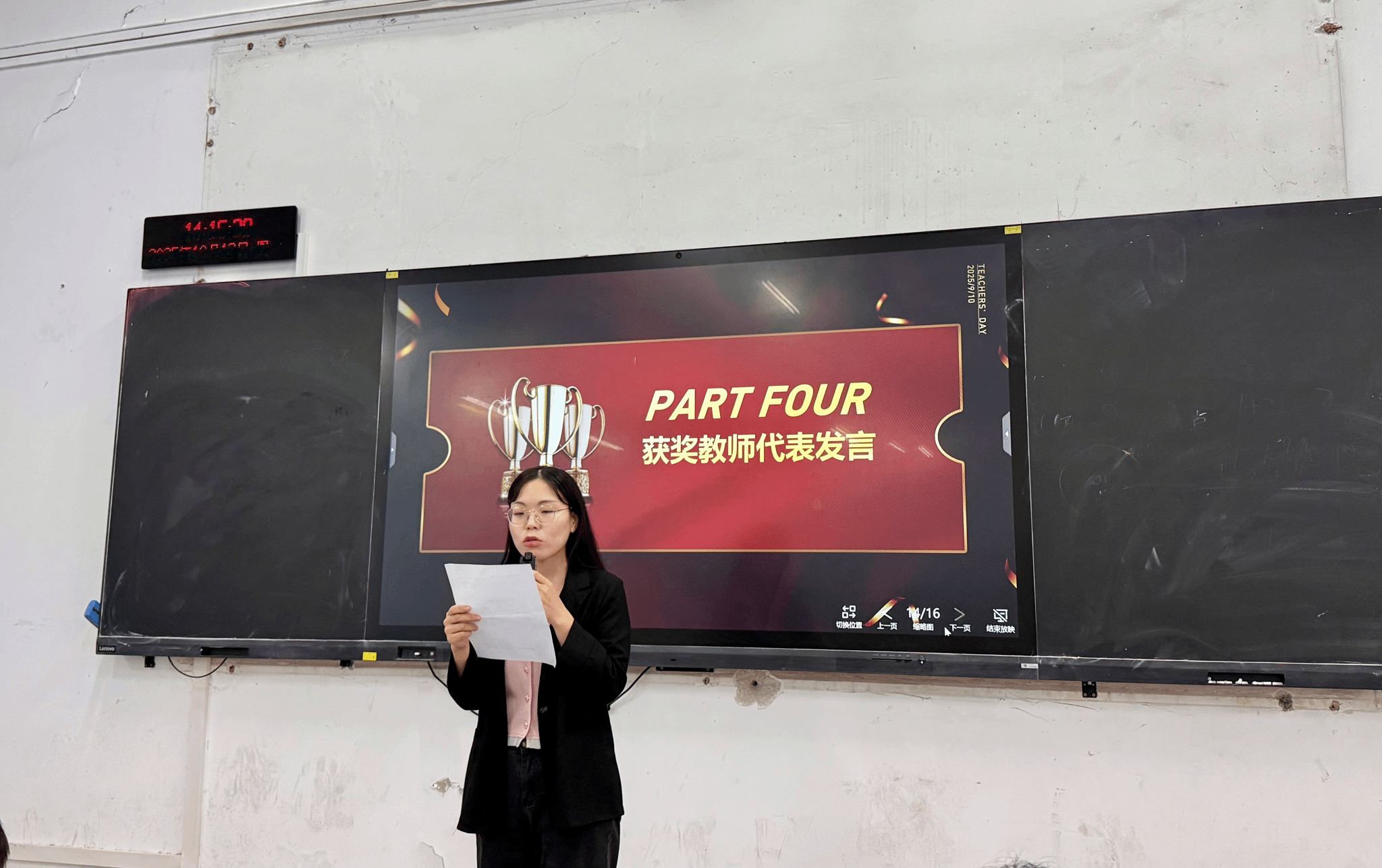 获奖教师代表岳晓红在发言中回顾了指导学生创作的过程,赞扬同学们“以奋斗为桨、创新为帆”,将宏大思政主题转化为富有感染力的青春表达。她强调,思政课不仅是知识的传递,更是价值的塑造与灵魂的唤醒。她呼吁全体教师继续以学生为中心,推动思政课从课堂走向实践,从理论走向生活。