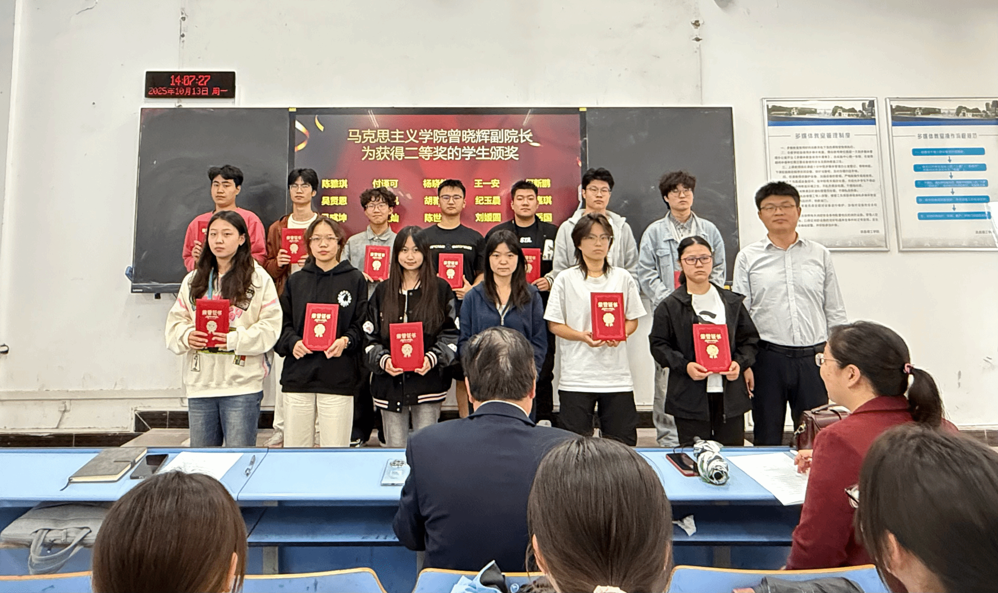 会上,马博老师宣读了大赛获奖学生和指导教师名单。据悉,大赛自2025年6月启动以来,共收到参赛作品110件,涵盖“大学生讲思政课”“我心中的思政课”微电影以及手绘地图三大类别。经校外专家匿名评审,评选出“大学生讲思政课”一等奖2名、二等奖3名、三等奖5名;“我心中的思政课”微电影一等奖2名、二等奖3名、三等奖5名;手绘地图一等奖2名、二等奖3名、三等奖2名。