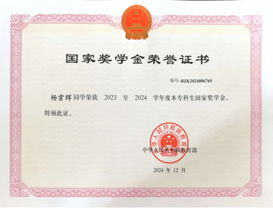 杨雲辉学习成绩优异,本科期间,前三年学习成绩专业排名第一,综合成绩总计排名第一,平均绩点高达3.75,专长学分高达5.2。在大学生艺术团任职期间,他策划,主持,参与各类校园文化活动200余场,其中包括接待诺贝尔奖获得者。他带领大学生艺术团与武汉群众文化艺术馆,江夏区文化艺术馆等建立联系,为学校美育课堂搭建贡献属于自己的青春力量。从校内走向校外,杨雲辉不断拓展舞台场景,积累了丰富的实战经验。
