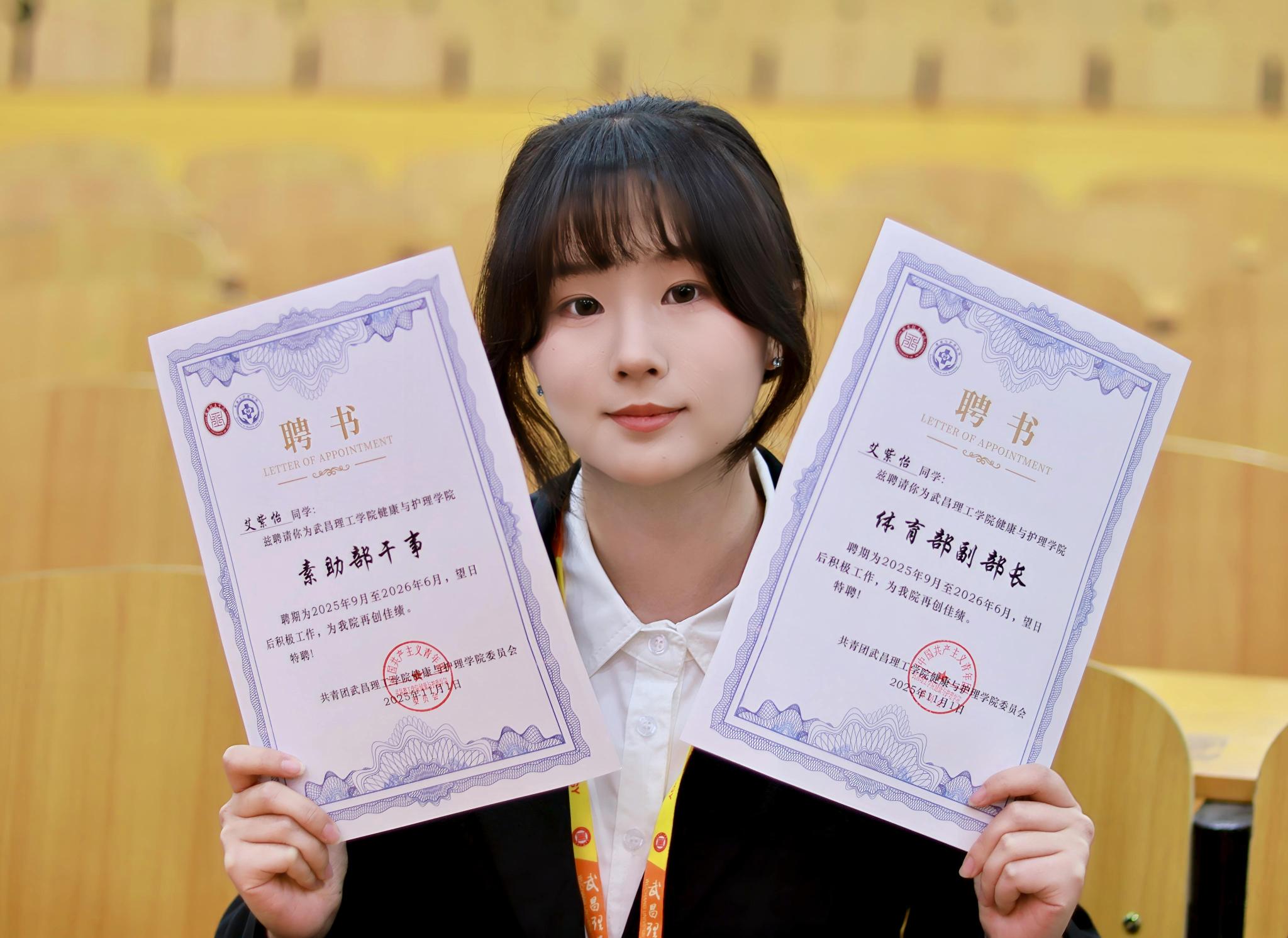 艾紫怡以踏实与担当诠释学生干部的职责。作为素质导师助理,她精准搭建师生沟通桥梁,协助新生适应校园节奏、助力班委完善班级管理。作为院级学生会体育部副部长,她牵头组织院级体育活动、开展干事培训,既带动新生增强身体素质,也梳理出清晰的部门工作流程。担任班级劳生委员期间,她细致打理公共卫生,及时协调解决卫生难题,助力班级多次登上卫生红榜,以精益求精的态度凝聚起集体向心力。