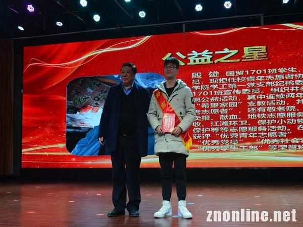 2019年12月19日晚上6:30,武昌理工学院商学院在大学生活动中心三楼梅南礼堂隆重举行了梅南之星颁奖典礼。此次“梅南之星”共设有“创新创业之星”、“管理之星”、“党员模范之星”、“学习之星”、“文艺之星”、“体育之星”和“公益之星”七项。其中,来自国贸1701班殷雄荣获“公益之星”的称号。