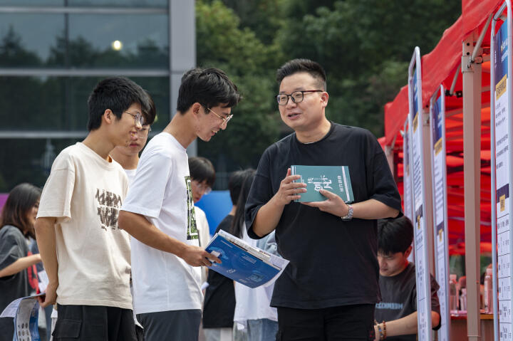 10月19日,浙江省金华职业技术学院校园里,大学生在招聘会上与用人单位交流。拍友胡肖飞摄
