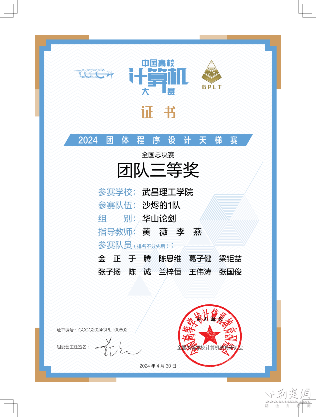 荆楚网(湖北日报网)讯(记者唐天琪 通讯员周黎)6月13日,记者从武昌理工学院获悉,该校人工智能学院学子在第九届“中国高校计算机大赛——团体程序设计天梯赛”全国总决赛中表现优异,斩获“华山论剑”组全国团队三等奖1个,全国个人三等奖3人,同时获得湖北省团队二等奖和三等奖各1个。这一成绩在湖北省民办高校中名列前茅。