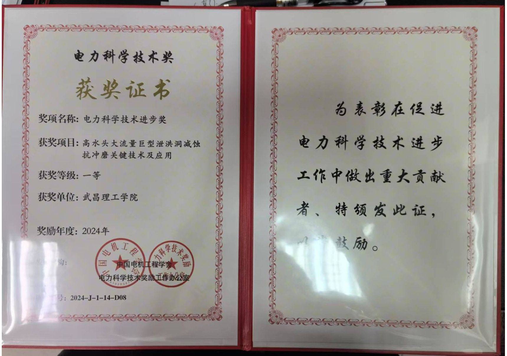 中国电力科学技术奖是中国电力领域最具影响力和权威性的奖项之一,体现了中国电力技术发展的最新和最高成果。“2024年度电力科学技术奖”在中国电机工程学会成立 90 周年暨2024 年年会上正式颁发。武昌理工学院参与的《高水头大流量巨型泄洪洞减蚀抗冲磨关键技术及应用》项目荣获中国电力科学技术进步奖一等奖,是全国同类高校唯一获得一等奖的高校!2024年,武昌理工学院还获得中国地理信息科技进步奖二等奖1项、中国自动化学会科技进步奖二等奖1项、湖北省科技进步奖三等奖1项。截至目前,学校获得国家级、省部级科技进步奖和人文社科奖共14项,获奖数量位居全国同类高校第一。
