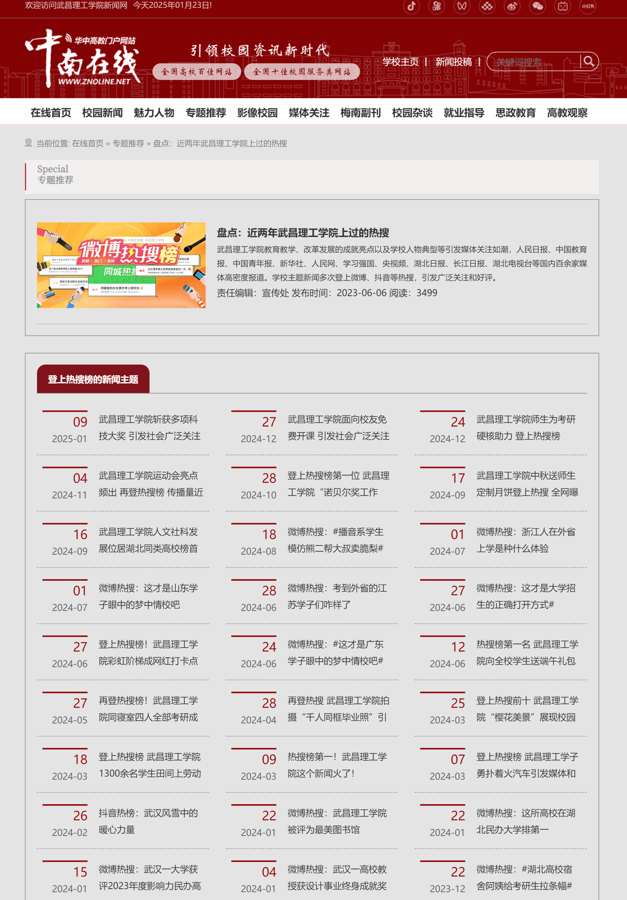 2024年,武昌理工学院教育教学改革发展的成就亮点以及各类人物典型等引发媒体关注如潮,外宣发稿数量超1100篇,稳居全省乃至全国同类高校前列。全年推发20余个主题新闻,均被数十家媒体转发,引爆舆论。《武昌理工学子勇扑着火汽车》《武昌理工学院1300余名学生田间上劳动教育课》《武昌理工学院同寝室四人全部考研成功》《武昌理工学院中秋送师生定制月饼》《武昌理工学院人文社科发展位居湖北同类高校榜首》《武昌理工学院“诺贝尔奖工作站”揭牌》《武昌理工学院运动会开幕式亮点频出》《武昌理工学院面向校友免费开课》等26个主题新闻还登上了微博、抖音热搜热榜,多个主题还位居热搜榜榜首,总传播量超4千万次,引发广泛关注和好评。
