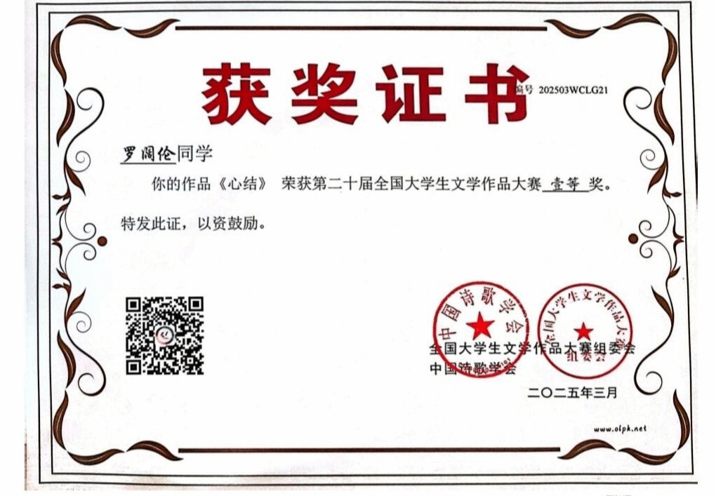 在本次大赛中,武昌理工学院汉语言2308班罗阔伦同学的作品《心结》荣获一等奖,成为众多优秀作品中的佼佼者。这篇散文以作者的真实生活经历为蓝本,生动地讲述了主人公从农村走向城镇生活的过程中,所面临的城乡差异以及成长中的道德困境。作品以细腻的笔触、真挚的情感,深刻地展现了主人公在困境中对“良知”重要性的深刻领悟,引发了读者的强烈共鸣,展现了作者扎实的文学功底和独特的创作视角。