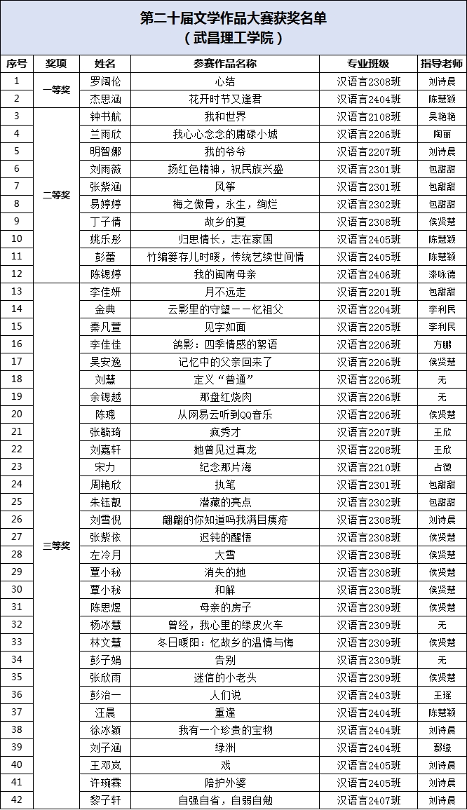 近日,第二十届全国大学生文学作品大赛结果公布,武昌理工学院42件作品获奖,其中一等奖作品2件,二等奖作品10件,三等奖作品30件,13名教师荣获优秀指导教师称号,获奖数量和层次再创新高。
