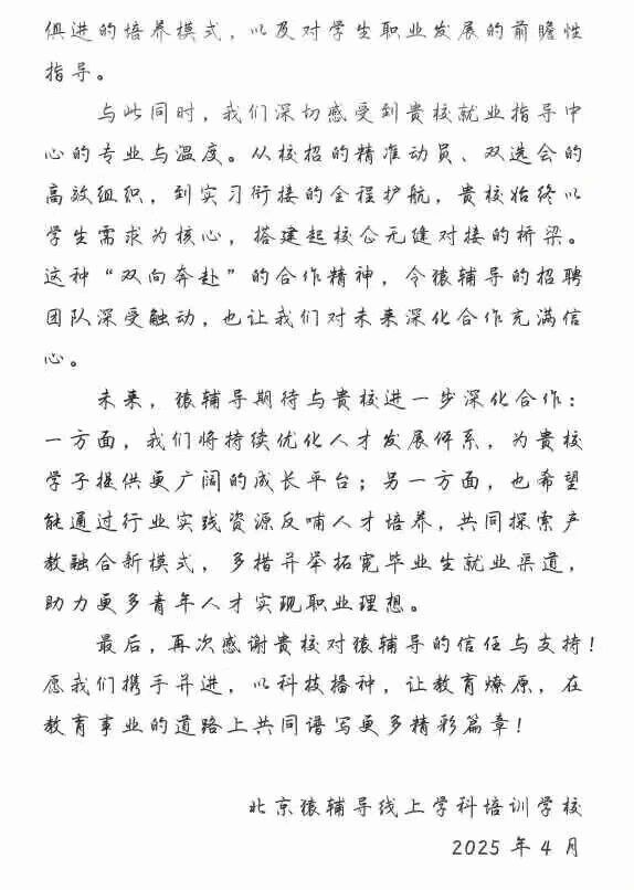 北京猿辅导在信中写道:“从校招的精准动员、双选会的高校组织,到实习衔接的全程护航,贵校始终以学生需求为核心,搭建起校企无缝对接的桥梁。这种双向奔赴的合作精神,令猿辅导团队深受感动,也让我们对未来深化合作充满信心。”