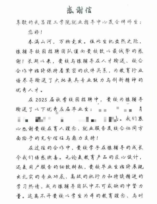 “无论是教育产品的匠心设计,还是用户服务的细致耕耘,贵校毕业生始终展现出扎实的专业功底、高效的执行力和持续精进的学习热情,成为猿辅导团队中不可或缺的中坚力量。”近日,北京猿辅导向武昌理工学院发来一封感谢信,赞扬该校的教育理念,对该校为猿辅导机构输送大量优秀人才表达感谢。