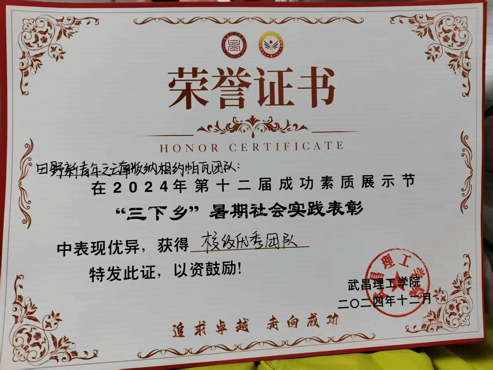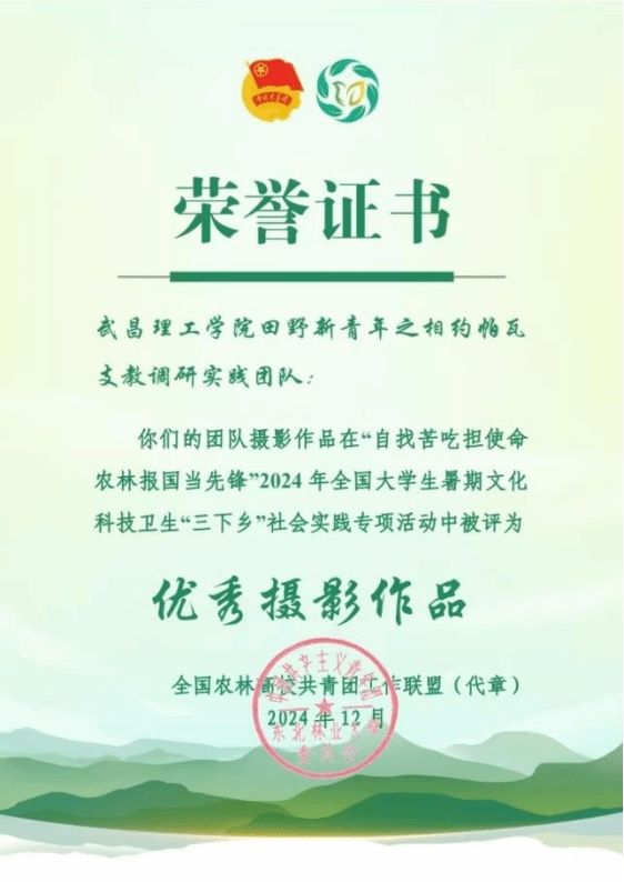 近日,全国农林高校共青团工作联盟传来喜讯,武昌理工学院影视传媒学院"田野新青年之相约帕瓦"支教调研实践团队在“自找苦吃担使命,农林报国当先锋”2024年全国大学生暑期文化科技卫生“三下乡”社会实践专项活动中表现卓越,荣获优秀摄影作品奖和优秀视频作品奖。