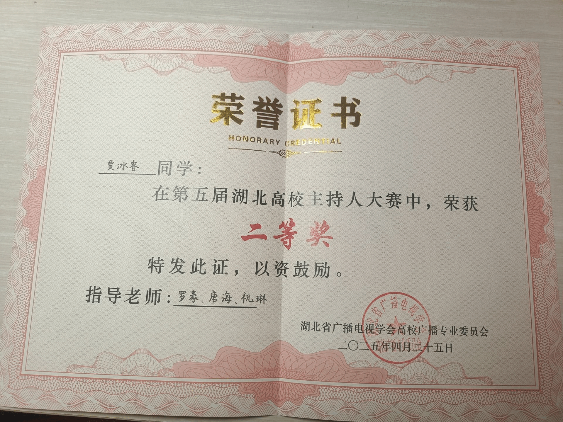 4月25日,第五届湖北高校主持人大赛圆满落幕。武昌理工学院影视传媒学院播音与主持艺术专业大一学生贾冰睿在影视传媒学院及党委宣传部老师的指导下,凭借出色发挥,从众多参赛者中脱颖而出,斩获大赛二等奖。
