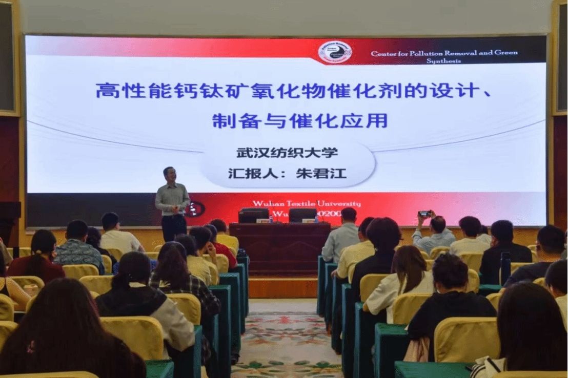 朱君江,武汉纺织大学化学与化工学院院长,湖北省“楚天学者计划”特聘教授,主持包括国家自然科学基金面上基金、湖北省科技厅重大专项等14项纵向项目;以第一完成人荣获湖北省自然科学奖二等奖、三等奖各1项,以第四完成人获中国稀土学会稀土科学技术奖一等奖1项,还拥有6项授权国家发明专利等卓越成就,主要开展环境污染物催化消除和有机化工中间体绿色合成方面的研究。此次学术讲座朱君江教授讲解了高性能钙钛矿催化剂的制备策略,并围绕高性能钙钛矿的外部形貌、内部结构以及抗失活能力三个方面进行了专业的学术讲解。