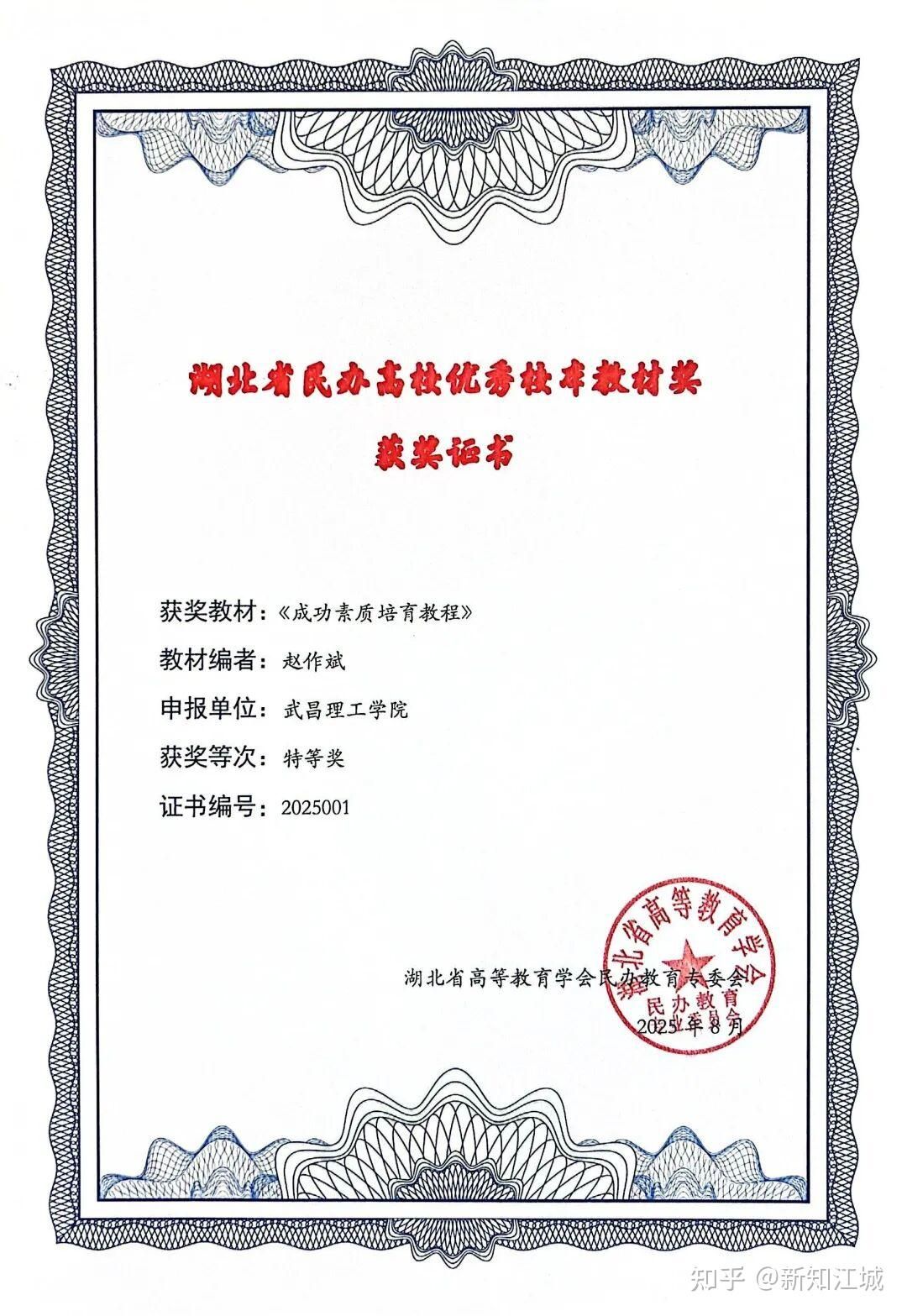 本次评选共评定获奖教材 38 部,其中特等奖 3 部、一等奖 6 部、二等奖 10 部、三等奖 19 部。对评选出的优秀校本教材,专委会将授予 “湖北省民办高校优秀校本教材” 称号,并颁发相应证书。武昌理工学院校长赵作斌教授编著的教材《成功素质培育教程》《大学生创新素质培育教程》均荣获特等奖。