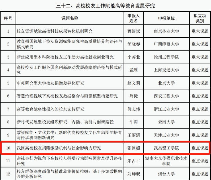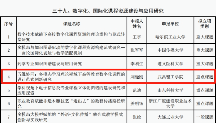 近日,中国高等教育学会公布“2025年度高等教育科学研究规划课题”立项名单。武昌理工学院申报的两项课题——《五维协同:多模态学习理论视域下高等教育数字化课程的设计范式创新研究》与《我国高校校友捐赠激励机制与社会影响力研究》获批重点课题。重点课题立项数为湖北省同类高校第一。