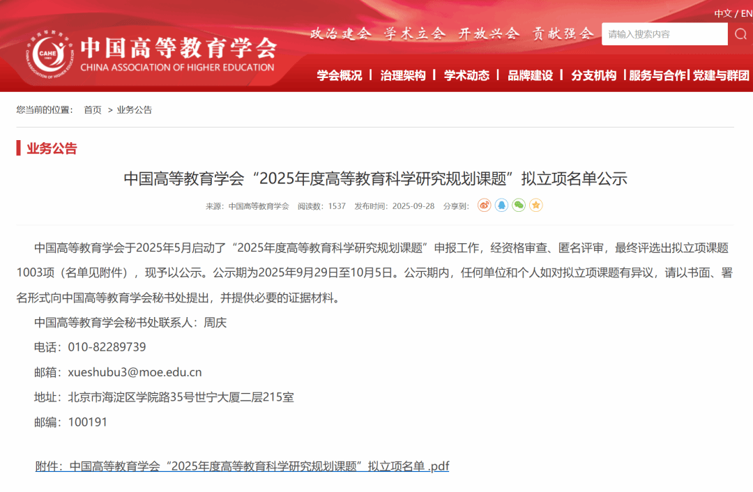 中国高等教育学会是教育部直属的国家级学术社团,其组织的“2025年度高等教育科学研究规划课题”在业内具有广泛影响力。该课题立项竞争激烈、筛选严格,申报人须具备高级职称或博士学位,或经单位择优推荐,并实行限额申报制度。所有项目均经过多轮匿名评审。