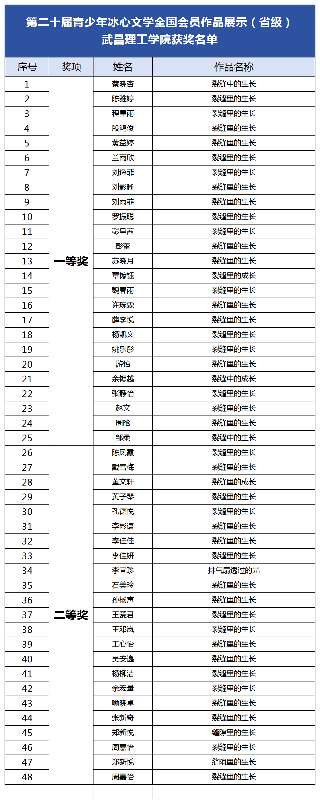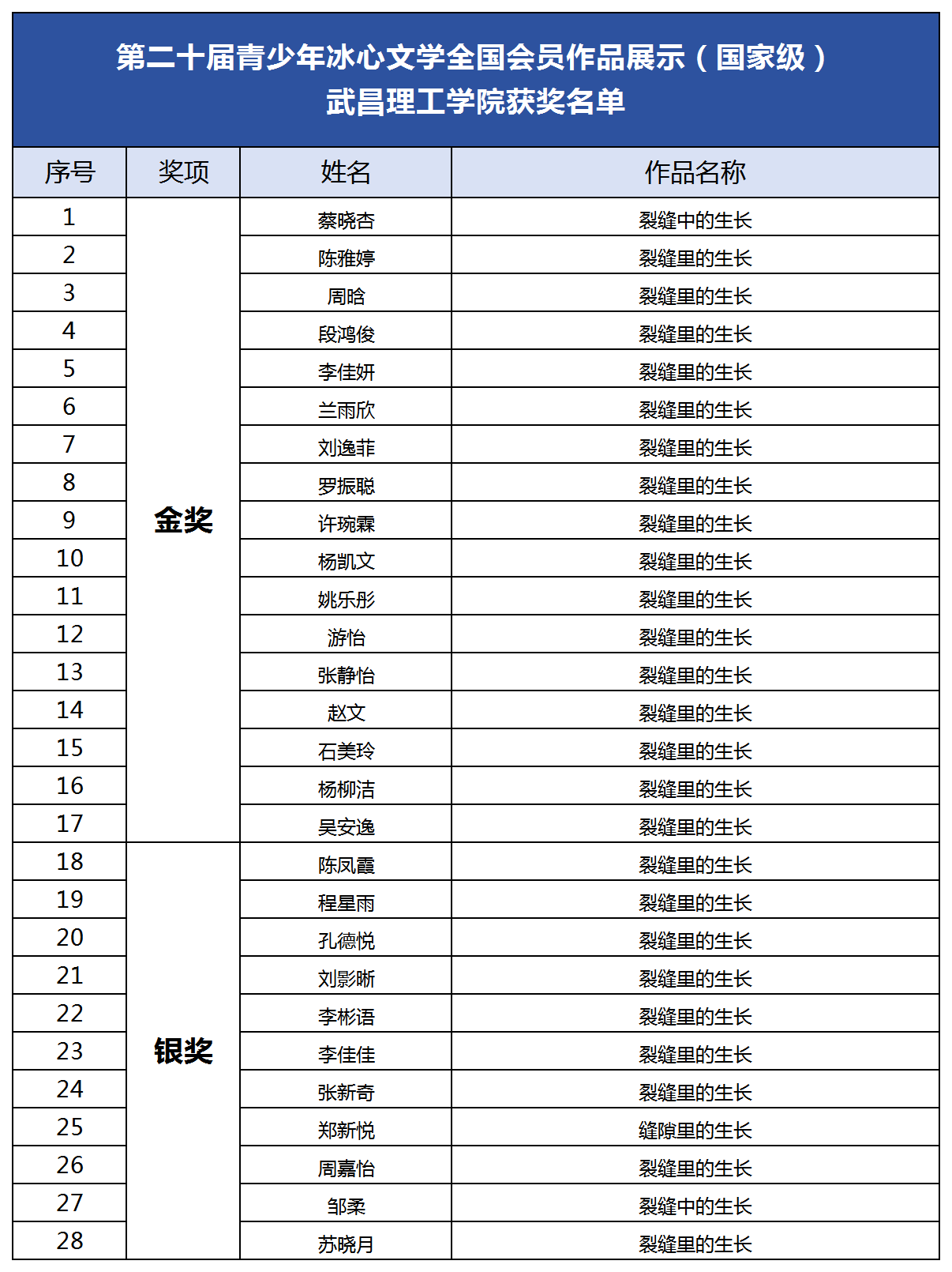 近日,第二十届全国青少年冰心文学征稿活动评选结果正式公布。武昌理工学院学子在本届活动中表现突出,共获国家级金奖17项、银奖11项,省级一等奖21项、二等奖25项。