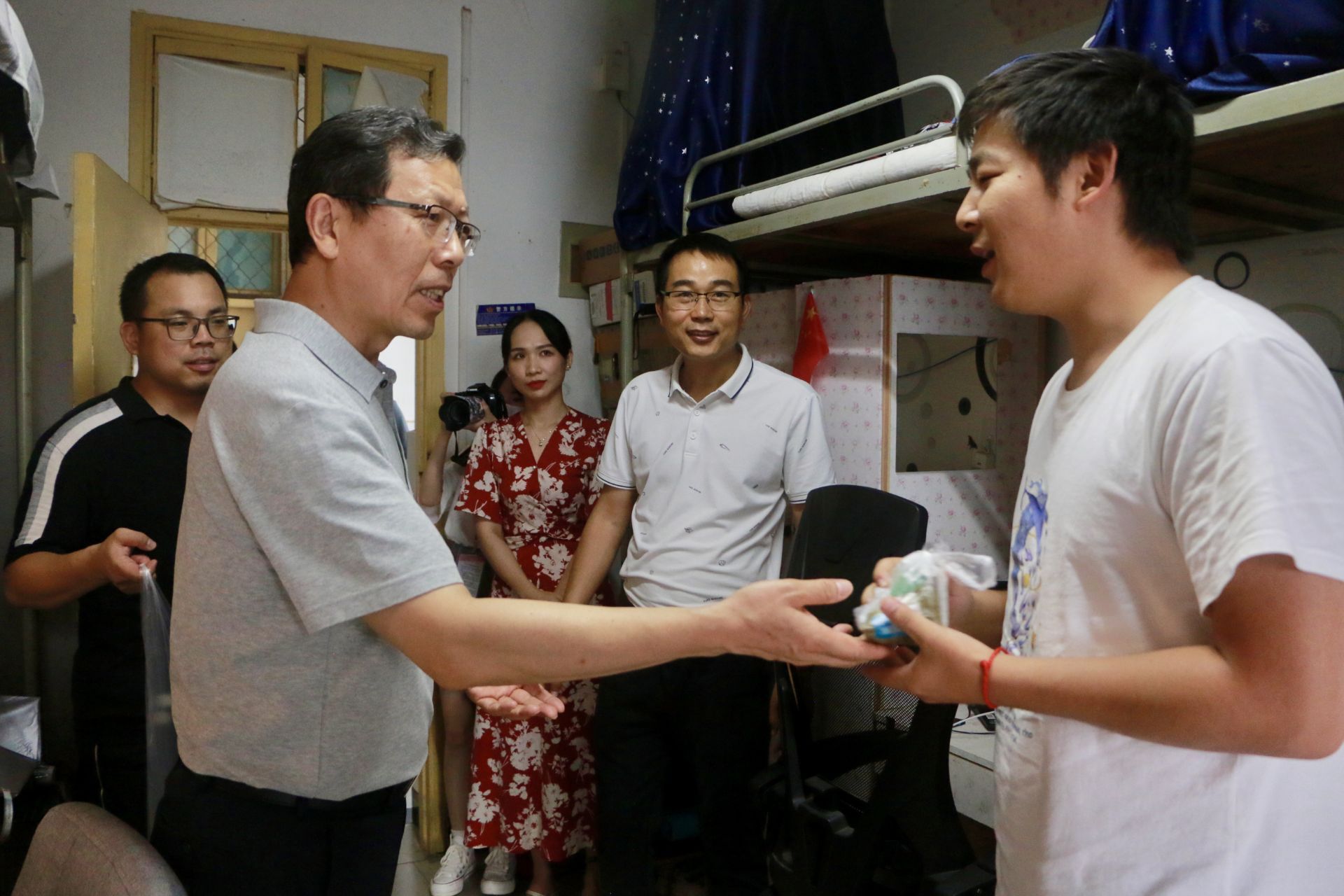 同学们收到学校领导送来的端午节礼物,都欣喜不已。“寝室生活还适应吗?”“期末考试复习准备得怎么样啦?”“要少熬夜多锻炼,按时吃饭。”在走访中,校领导与同学们亲切交流,认真倾听学生们的心声,全面细心地了解同学们在生活上、心理上、学习上的情况,为他们送去来自学校的关心与关怀。