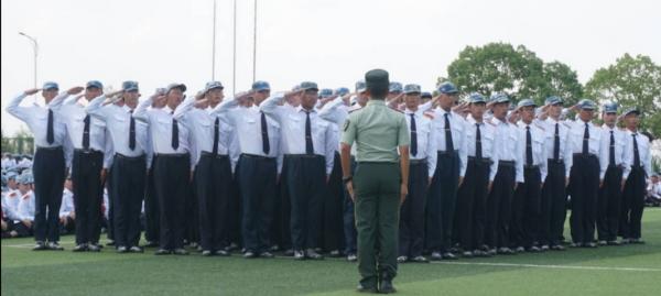 在东区运动场上,人工智能学院、艺术设计学院、文法学院、影视传媒学院的2021级新生一展风采。虽然只有九天的训练,但时间之短促成了他们更加努力地训练,在每天三十五、六摄氏度的高温下,光是站着就汗流浃背,一阵阵热风吹过,顶着烈阳的他们坚持训练。来自商学院会计2102班的陈明妍同学表示:“军训对我们新生有很大的帮助,因为疫情的影响,高考结束后就一直在家里躺着,并没有做一些运动,虽然只有9天的时间,感觉自己体力增强了,更有耐力了。我印象最深刻的就是我们站军姿要夹扑克牌,最高纪录是11张。” 二营五连的教官周亚鑫说道:“在训练中,一定要对他们严格要求,要把生活和军训分开,因为他们都是第一次离开家,到一个陌生环境,要主动帮助他们解决困难,当好他们人生的引路人。根据不同的性格来和他们相处,要不断地鼓励他们,这样可以提高他们的训练效果。”
