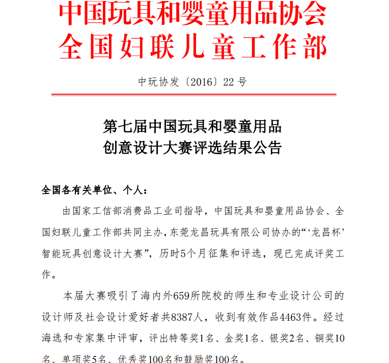 中国玩具和婴童用品协会自2010年起,每年定期举办全国性的创意设计大赛,大赛目前已成为中国玩具和婴童用品行业最具权威性和公正性的设计赛事。今年为第七届,大赛的主题是智能玩具创意设计,由国家工信部消费品工业司指导,中国玩具和婴童用品协会、全国妇联儿童工作部共同主办,东莞龙昌玩具有限公司协办。本届大赛吸引了海内外659所院校的师生和专业设计公司的设计师及社会设计爱好者共8387人,收到有效作品4463件。历时5个月征集海选和专家集中评审,评出特等奖1名、金奖1名、银奖2名、铜奖10名、单项奖5名。