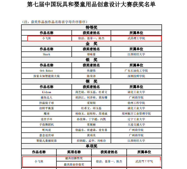 武昌理工学院艺术设计学院产品设计专业2014级学生徐洁、聂菲一、陈杰三位同学在产品设计系徐卓老师指导下,设计的作品《小飞侠》脱颖而出,获得全场唯一的最高奖项特等奖,同时还获得了两个单项奖——最具创新奖和最具商业价值奖。他们将获得奖金32000元,另颁发奖杯、证书,同时获邀参加今年10月19号在上海举行的颁奖典礼,并获邀参观2017年2月“美国纽约国际玩具博览会”。整体行程7天左右,参观展会的交通费(自国内统一出发地至美国纽约的往返交通)及展会期间的食宿费用由主办方统一承担。