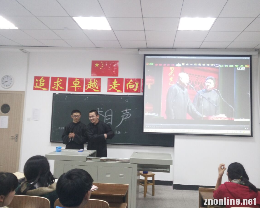这次“相声”特色班会由该班王智鹏、万德军两位同学表演,他们身着黑色大褂,首先介绍了相声的林林种种。“说学逗唱是相声的四大特点。工具有醒木、快板、大褂、御子、扇子。相声演绎的形式有单口、对口、群口、化妆相声、相声剧、双簧。”两人还分别展示了各自“说学逗唱”的功夫,“说有贯口、数来宝;学有唱歌、戏曲、口技、方言;逗有捧哏、逗哏、抓包袱、取笑;唱有太平歌词。”两人惟妙惟肖的演绎了怎么要钱、怎么二次要钱、怎么把人留住,逗得在场的同学都开怀大笑。