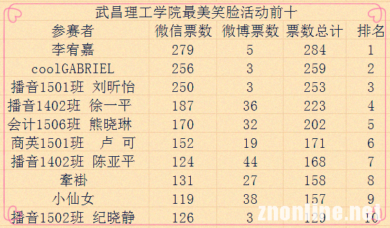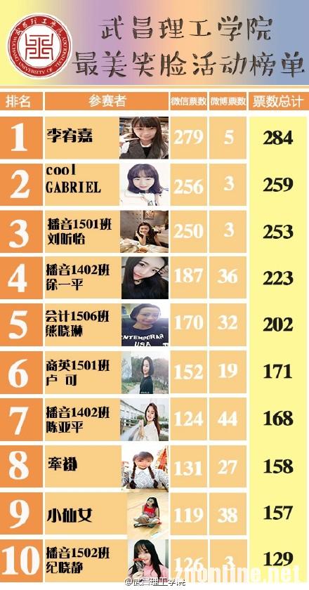 “十大女生最美笑脸”分别是:李宥嘉、coolGABRIEL、播音1501班刘昕怡、播音1402班徐一平、会计1506班熊晓琳、商英1501班卢可、播音1402班陈亚平、牽褂、小仙女、播音1502班纪晓静。