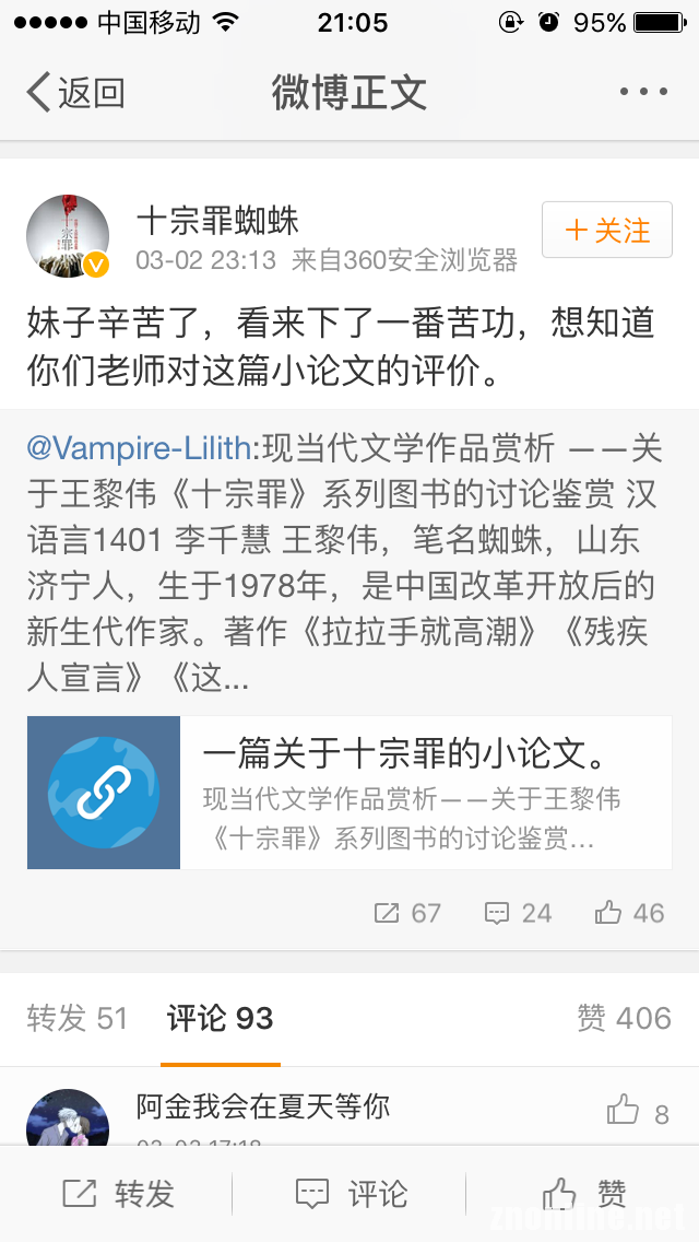中南在线3月7日消息(大通社记者 朱倩 报道)近日,武昌理工学院汉语言文学1401班学生李千慧的一篇关于《十宗罪》的论文被原作者王黎伟在微博上转载,目前已有七万点击量,两万阅读量。