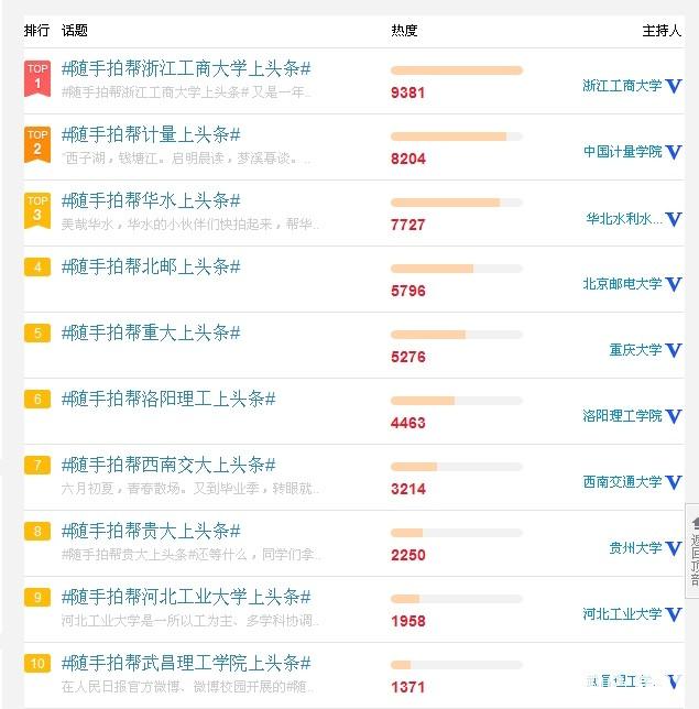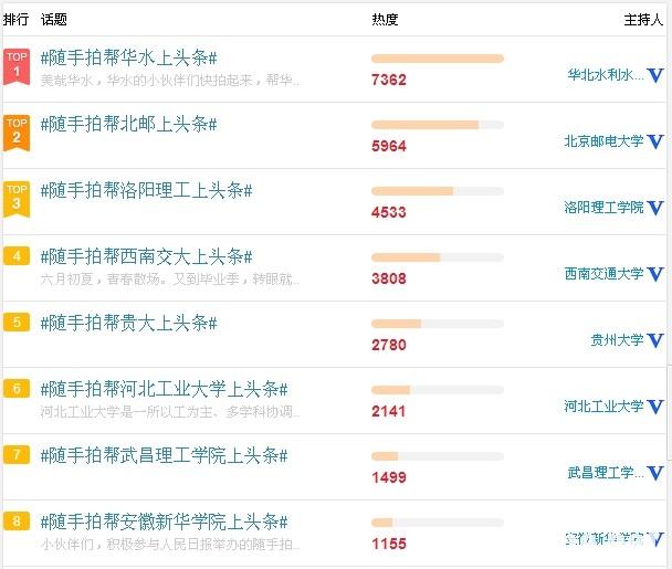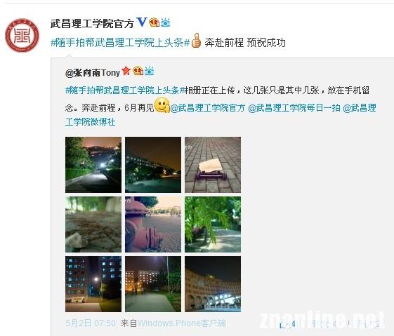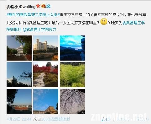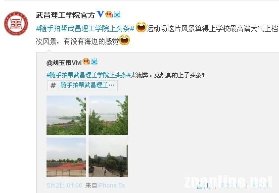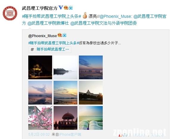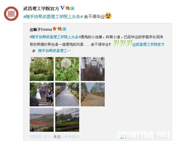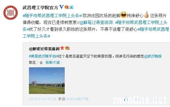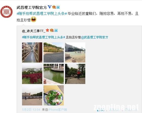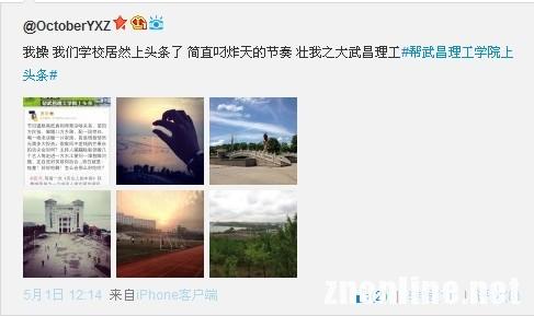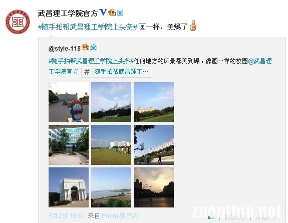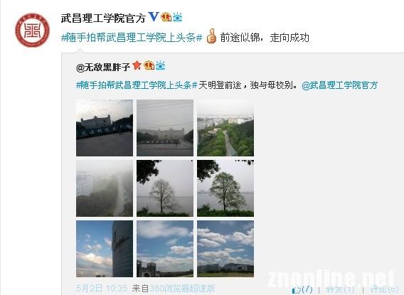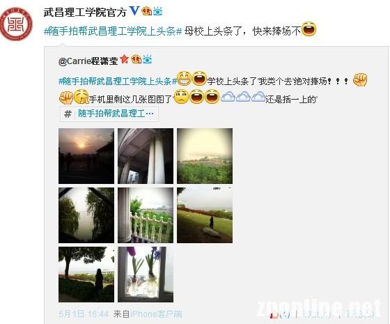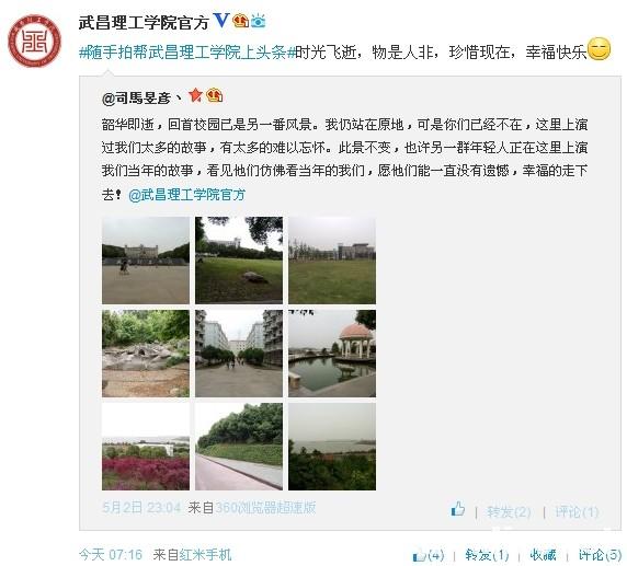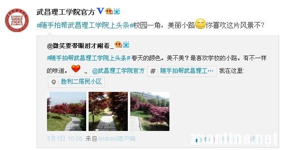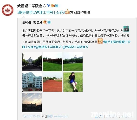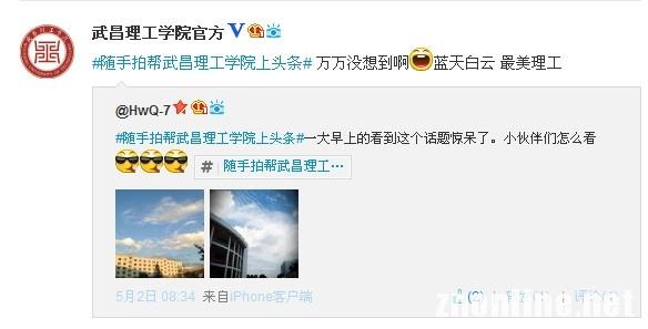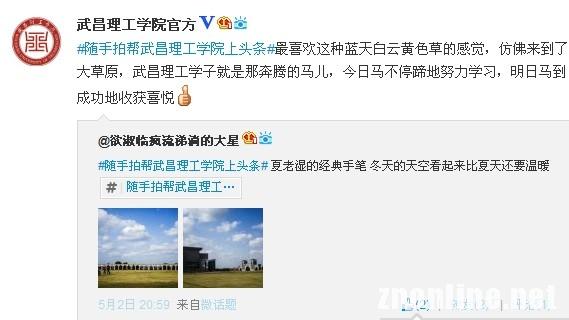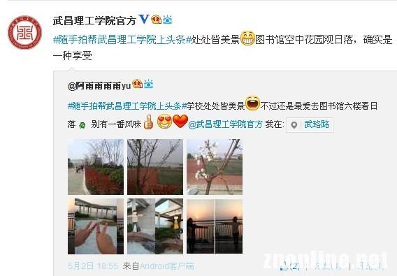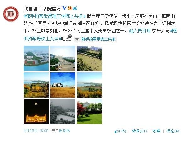 记录美好时刻,定格曾经的青春。#随手拍帮武昌理工学院上头条#活动受到了武昌理工学子的积极踊跃参与,截至5月3日上午,话题全部讨论310余条,40余个赞,643人参与抽奖活动,话题热度为1541,最高位居全国高校第7位。新浪微博还专门为武昌理工学院投放了客户端tips,让武昌理工学院真正上了“头条”。
