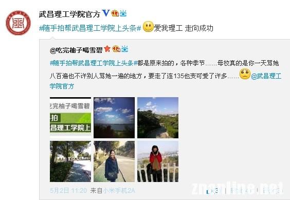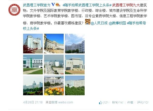 中南在线5月3日消息(记者 鲁信 报道)又到毕业季,转眼就要跟母校告别。近日,人民日报官方微博、微博校园开展了#随手拍帮母校上头条#公益行动,武昌理工学院官方微博发动本校话题#随手拍帮武昌理工学院上头条#,受到热捧,短短几天时间该话题全部讨论已达310余条,在全国高校#随手拍帮母校上头条#话题中位居全国高校第7位。