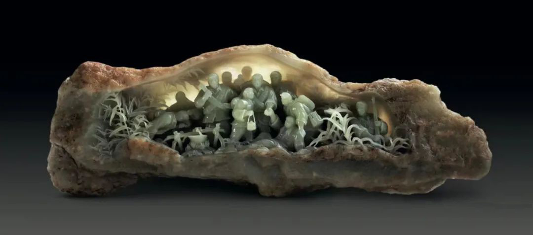 作品《星火燎原》描写了红军战士过草地的场景。没有世俗文化的赏心悦目,更不是商品性的作品,但它是革命先烈追求理想,超越物质、超越生命的一段神圣的、摄人心魂的历史,是新中国几代人的红色记忆。用珍稀的和田玉来雕琢红色题材的作品,不仅显示其独特的历史、文化价值,更具崇高、永恒的时代精神,并可存留下红军的历史,使之千万年不可磨灭。