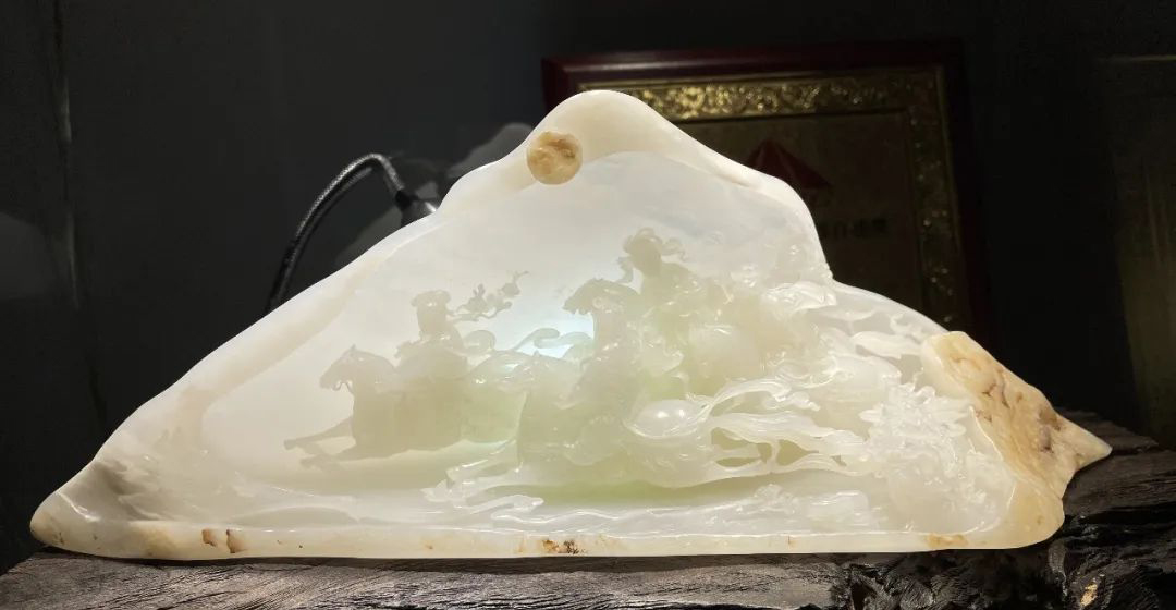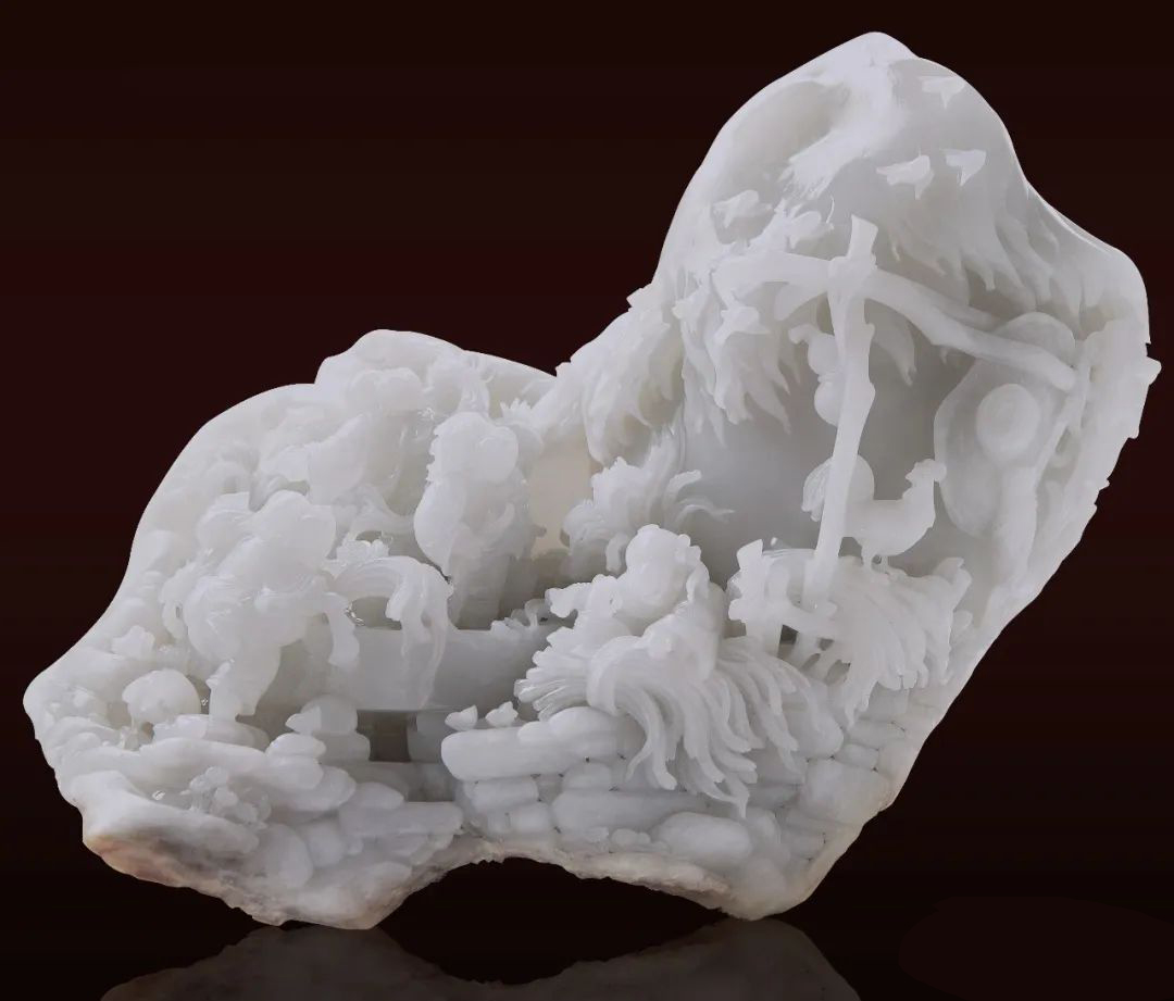 踏过一番天寒路,终得傲雪带香来。斩获金奖的作品《踏雪寻梅》,白马骄踏信步行,雪落无声。和田玉细腻温润的质地被构造成一幅玉琢银装的雪晴美景,银霜遍地,梅雪争春。夕阳西下,仕女们悠然自得,骑马踏春,折香而返。作品《踏雪寻梅》不加修饰,保留了玉石的天然皮色,好似风清日暖下,阳光融化大地。人物漫文尔雅,豆蔻粉黛凝霜雪,踏上撷枝暗香盈,银鞍照白马,飒沓如流星。