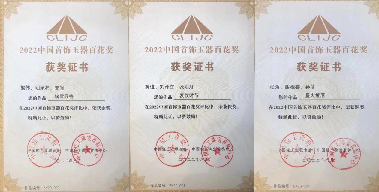 博览会期间,中国首饰玉器百花奖颁奖典礼隆重举行,中国轻工业联合会会长张崇和,党委副书记王世成,副会长何烨、刘江毅出席并为获奖者颁奖。武昌理工学院艺术设计学院工艺美术专业袁嘉骐大师教学团队斩获了金、银、铜三项大奖,熊伟、明承林、邹敏的作品《踏雪寻梅》获得金奖;黄俊、刘泽东、张明月的作品《麦收时节》获得银奖;张为、谢程睿、孙萌的作品《星火燎原》获得铜奖。
