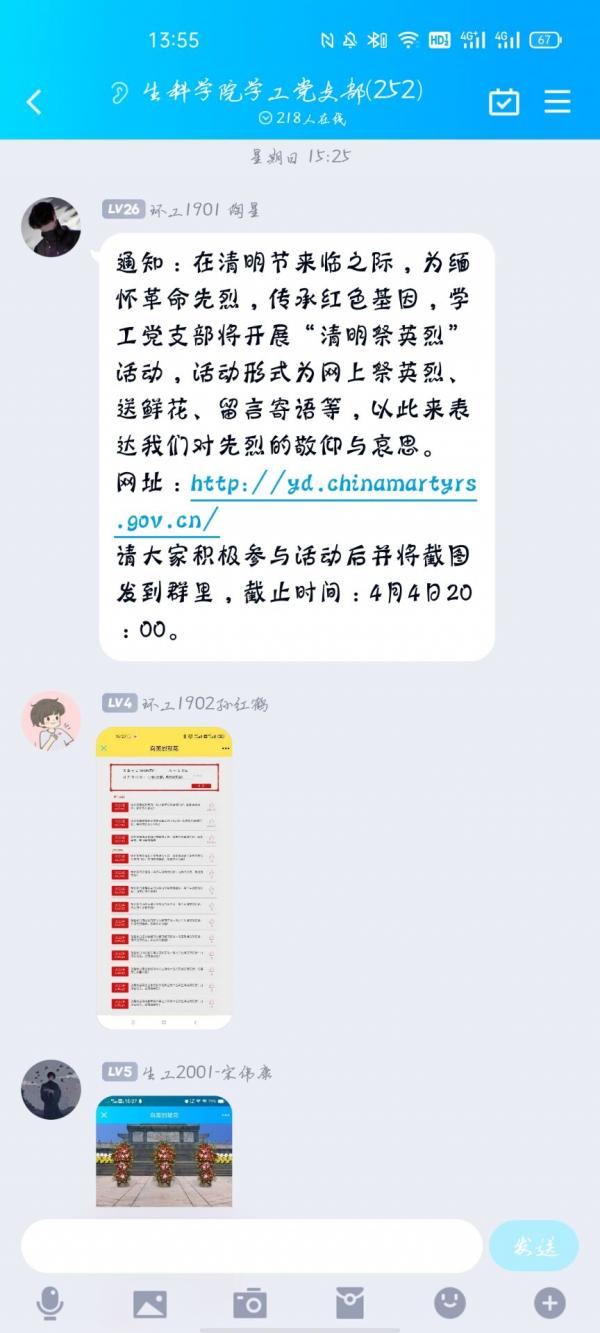中南在线4月5日消息(大通社记者 袁襄雨 通讯员 龙昱杉 报道)阳光照苍柏,又是清明时。作为新时代的学生更需要传承烈士舍己为人、不争功名的精神,懂得今天的幸福生活来之不易,激发对先烈的崇敬之情。从而发奋学习、热爱生活、孝顺父母、团结同学、尊敬老师、热爱班级、热爱社会。在清明节来临之际,为缅怀革命先烈,传承红色基因,武昌理工学院生命科学学院学工党支部开展“清明祭英烈”活动,活动形式为网上祭英烈、送鲜花、留言寄语等,以此来表达党组织成员对先烈的敬仰与哀思。
