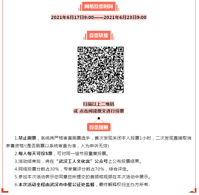 网络投票将于6月17日9时开启,6月23日9时结束,最终综合专家复评(70%)和网络投票(30%)成绩,评选出职工原创十佳歌曲(10首),职工最喜爱歌曲(1首,网络投票第一名),职工原创优秀歌曲(10首)。