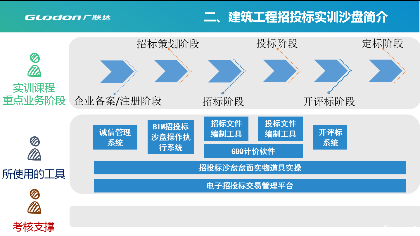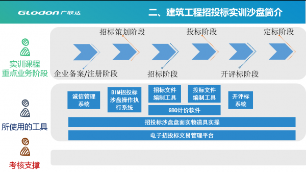 据悉,建筑工程招投标实训沙盘是面向工程造价、工程管理、建筑工程技术等专业学生,强化工程招投标专业实践应用能力,培育和提升招标采购专业人员“取道谋术、德才兼备”的工程招投标市场实战模型。广联达计量、计价软件的学习,则可以帮助工程造价专业学生解决土建专业估概算、招投标预算、施工进度变更、竣工结算全过程各阶段算量、提量、检查、审核全流程业务,以及民建工程造价全专业、全岗位、全过程的清单计价业务,实现一站式的BIM土建计量、计价。