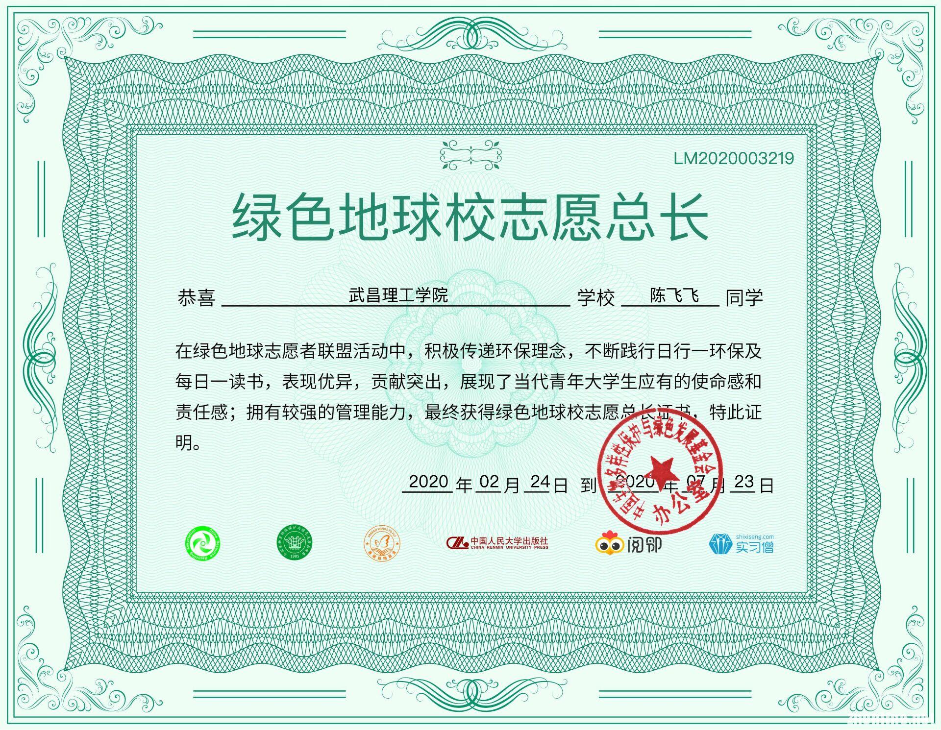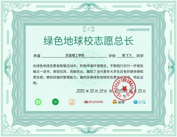中南在线7月28日消息(大通社记者 朱威龙 报道)2020年7月22日,陈飞飞完成了最后一次阅读打卡,成为武昌理工学院首位获得绿色地球志愿者联盟证书的学子。