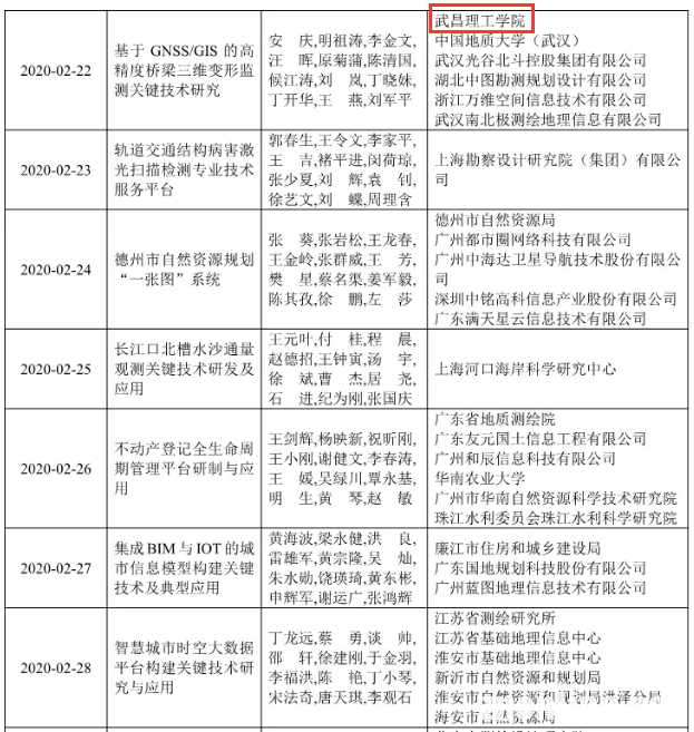 中南在线7月29日消息 近日,2020地理信息科技进步奖评选结果公示,全国获奖项目共107项,其中武昌理工学院主持完成的《基于GNSS/GIS 的高精度桥梁三维变形监测关键技术研究》项目获得二等奖。这也是该校获得的第二项中国地理信息科技进步二等奖,是该校主持获得的第五项省部级科技进步奖。