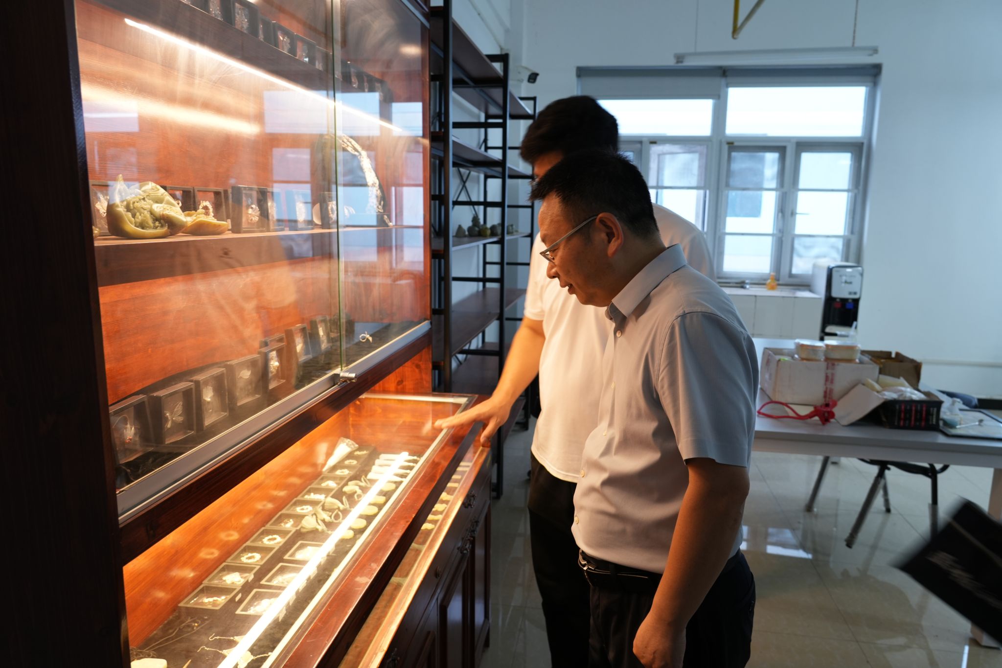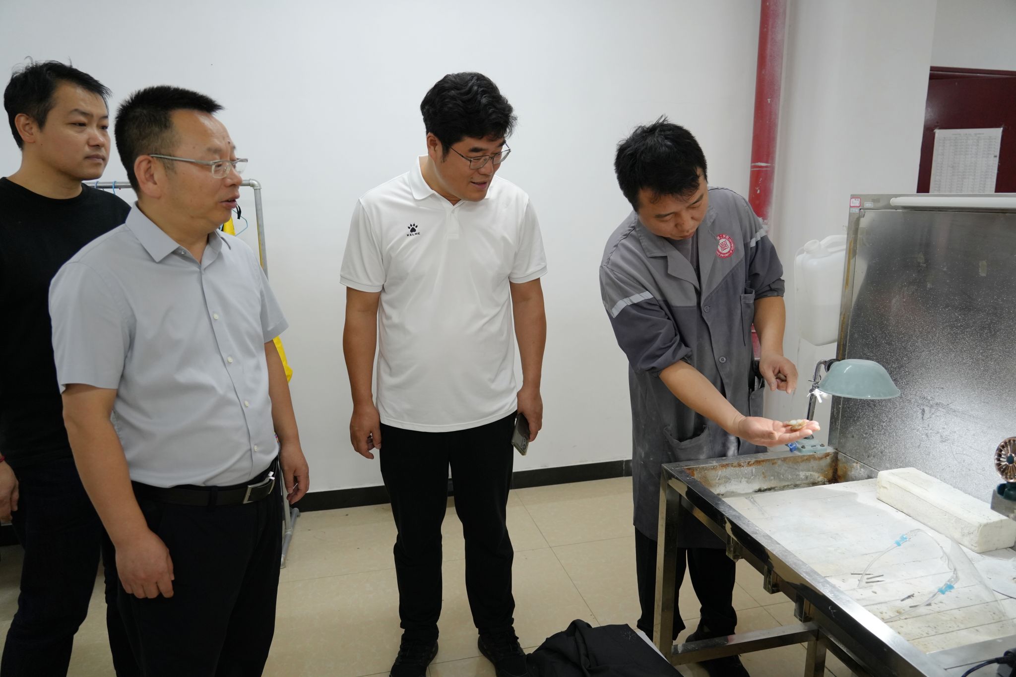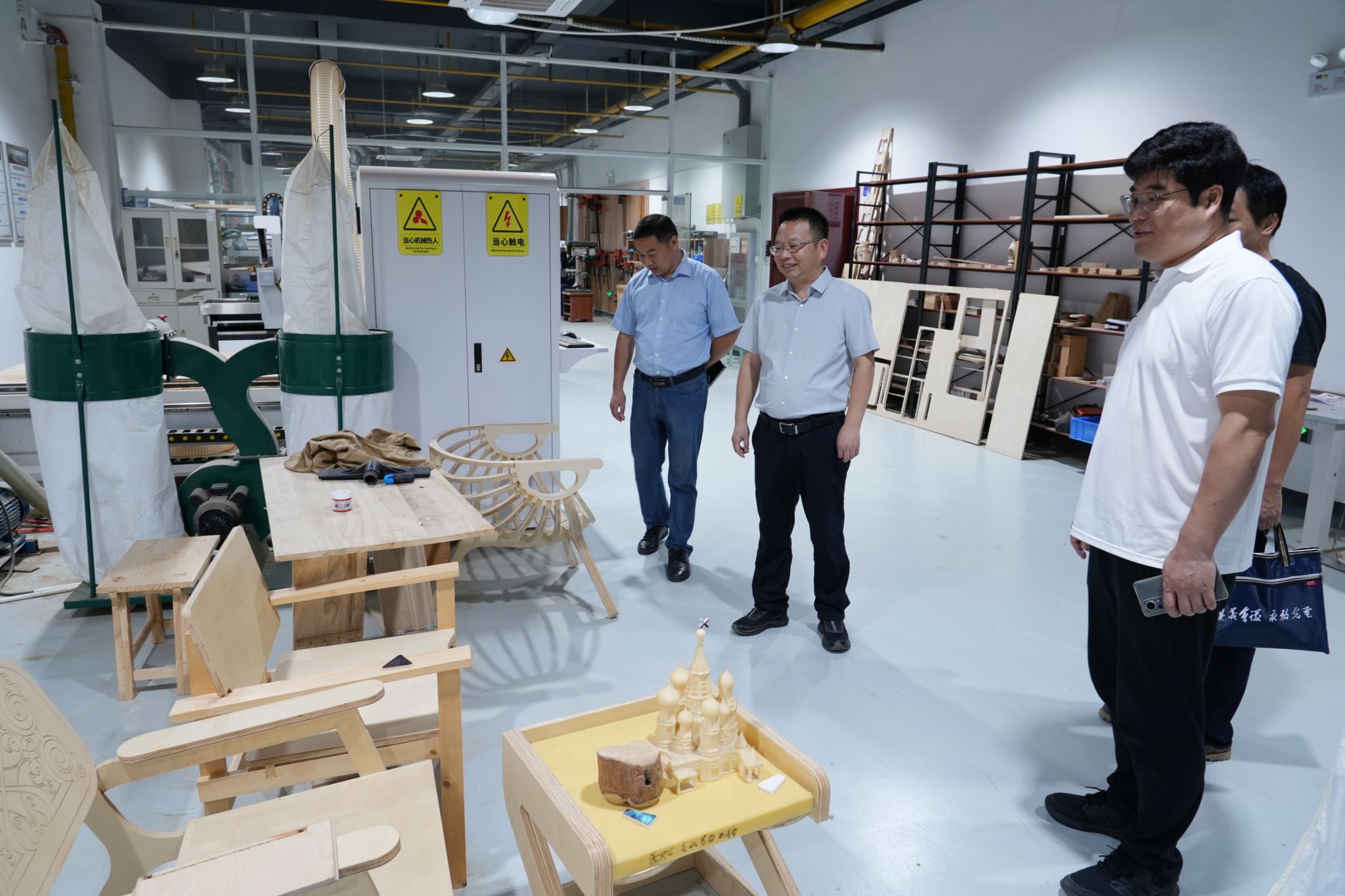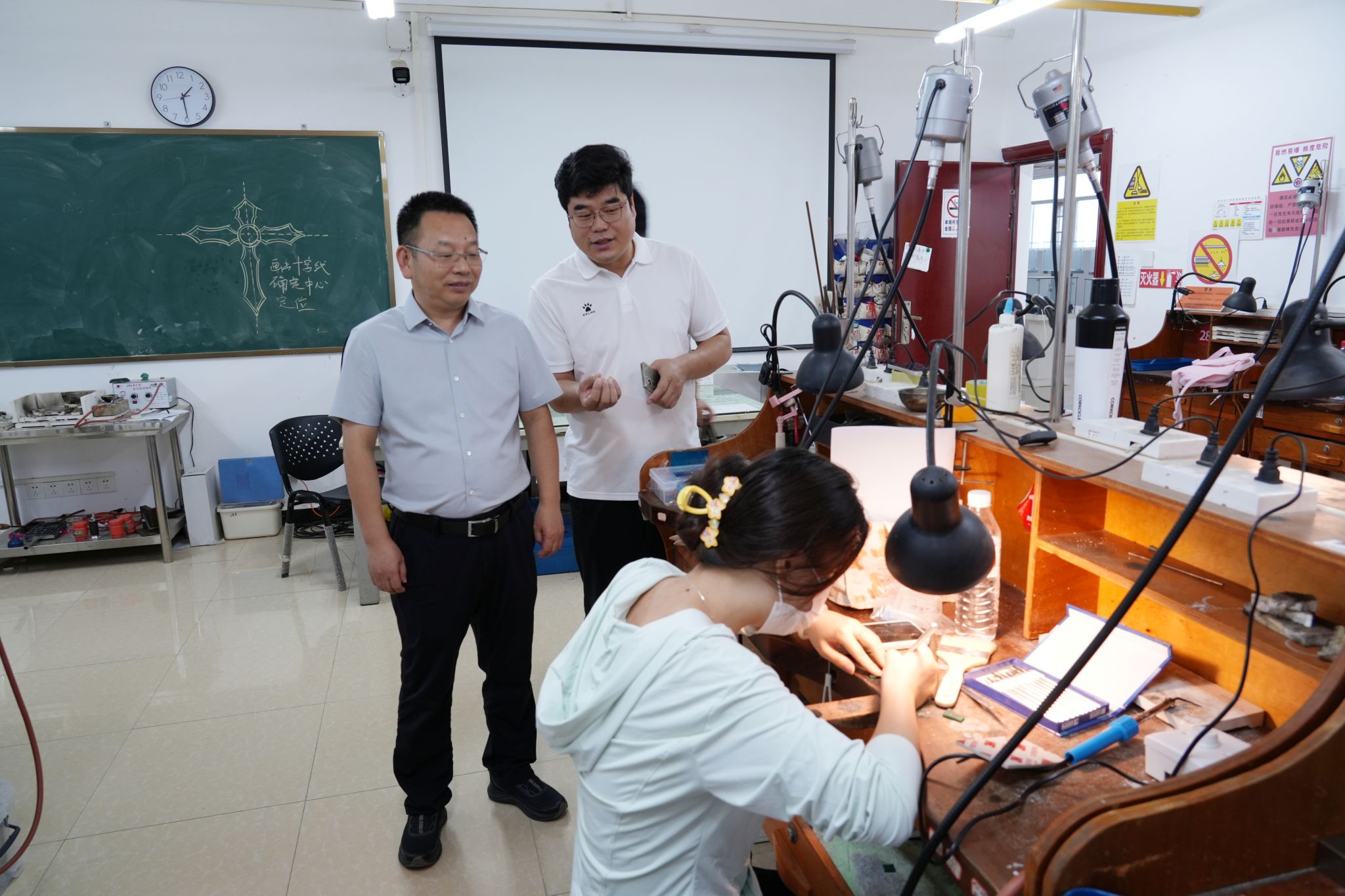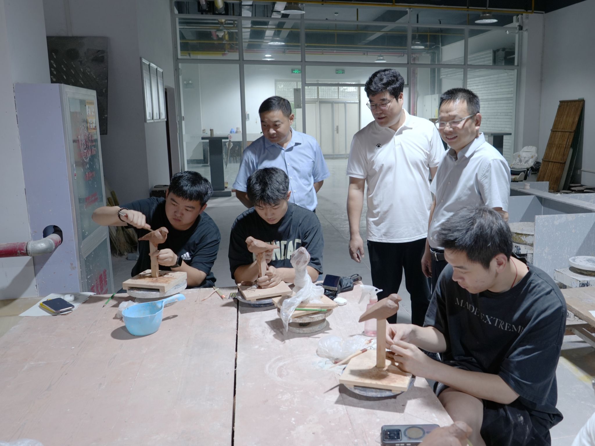 高建勋书记一行首先来到创意设计学院,实地参观了党员活动室和工艺美术大楼,细致查看了学生实践教学环境和创作成果,与师生亲切交流,深入了解实践教学环节和学生创新能力培养情况。