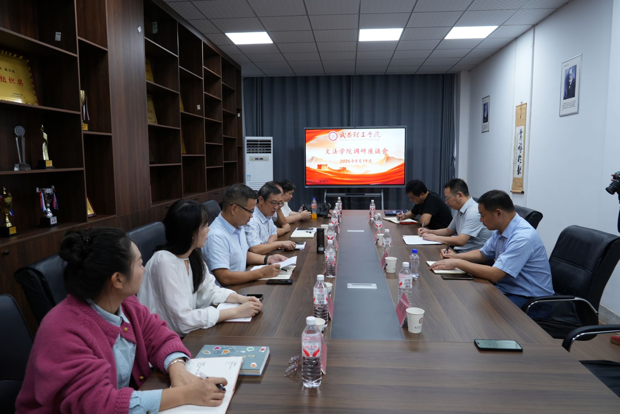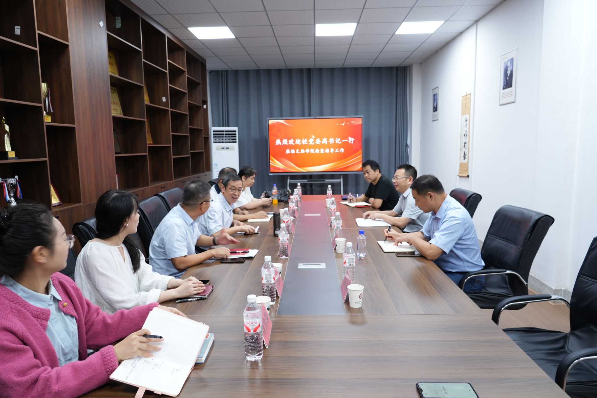 随后,高建勋书记一行来到文法学院进行调研。在座谈会上,文法学院院长胡德才介绍了学院师资结构、学科专业建设、学生基本情况、人才培养特色、未来发展面临的挑战与构想以及本学期重点工作。党总支书记南小烈汇报了学院党建工作的基本情况、人才培养的特色与成效、未来主要努力方向及思路,重点介绍了学院以“创新、创作、创业”为驱动的德育新模式。教学副院长陶欣荣、科研副院长范文琼分别就教学管理、科研工作进行了补充汇报。