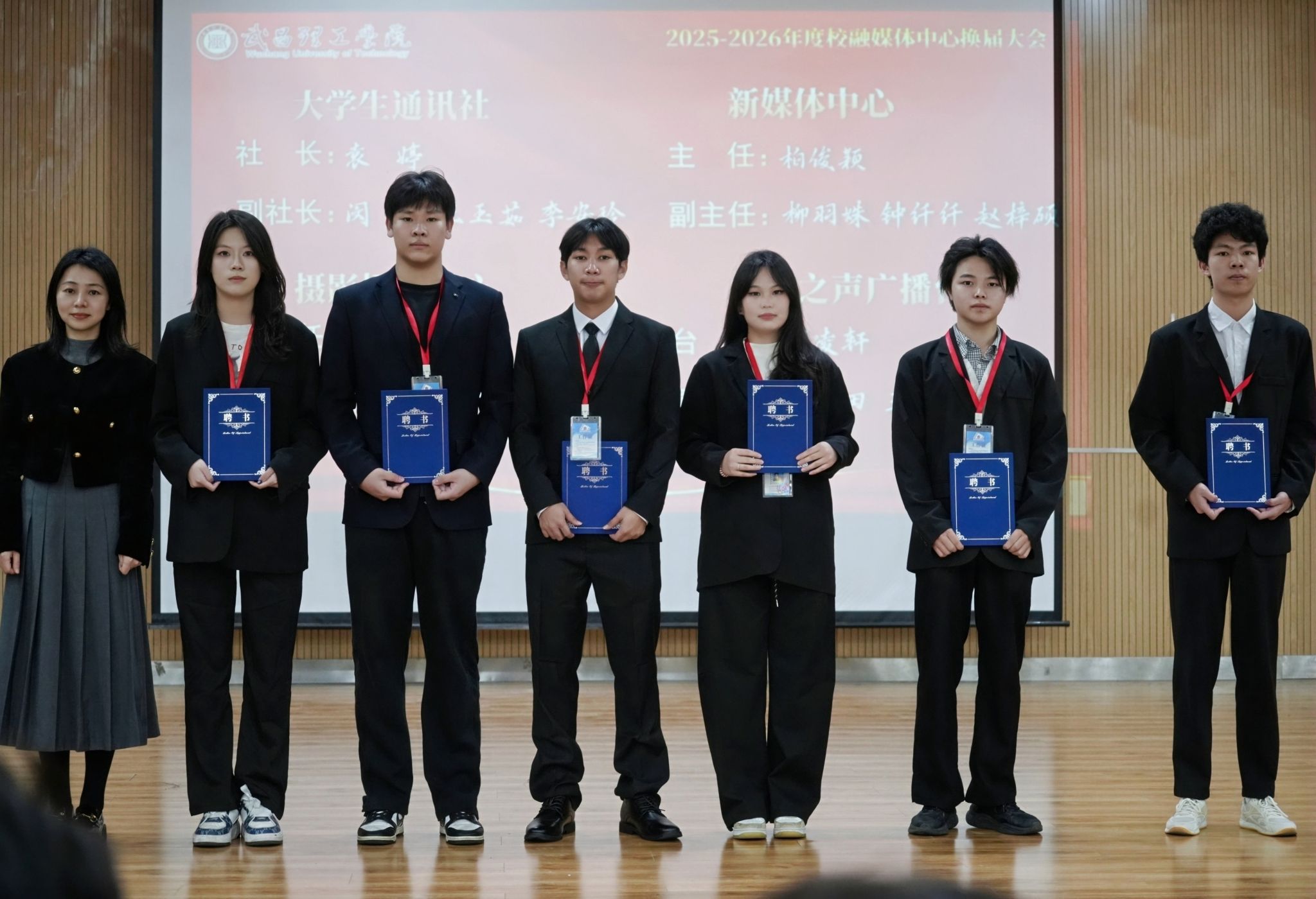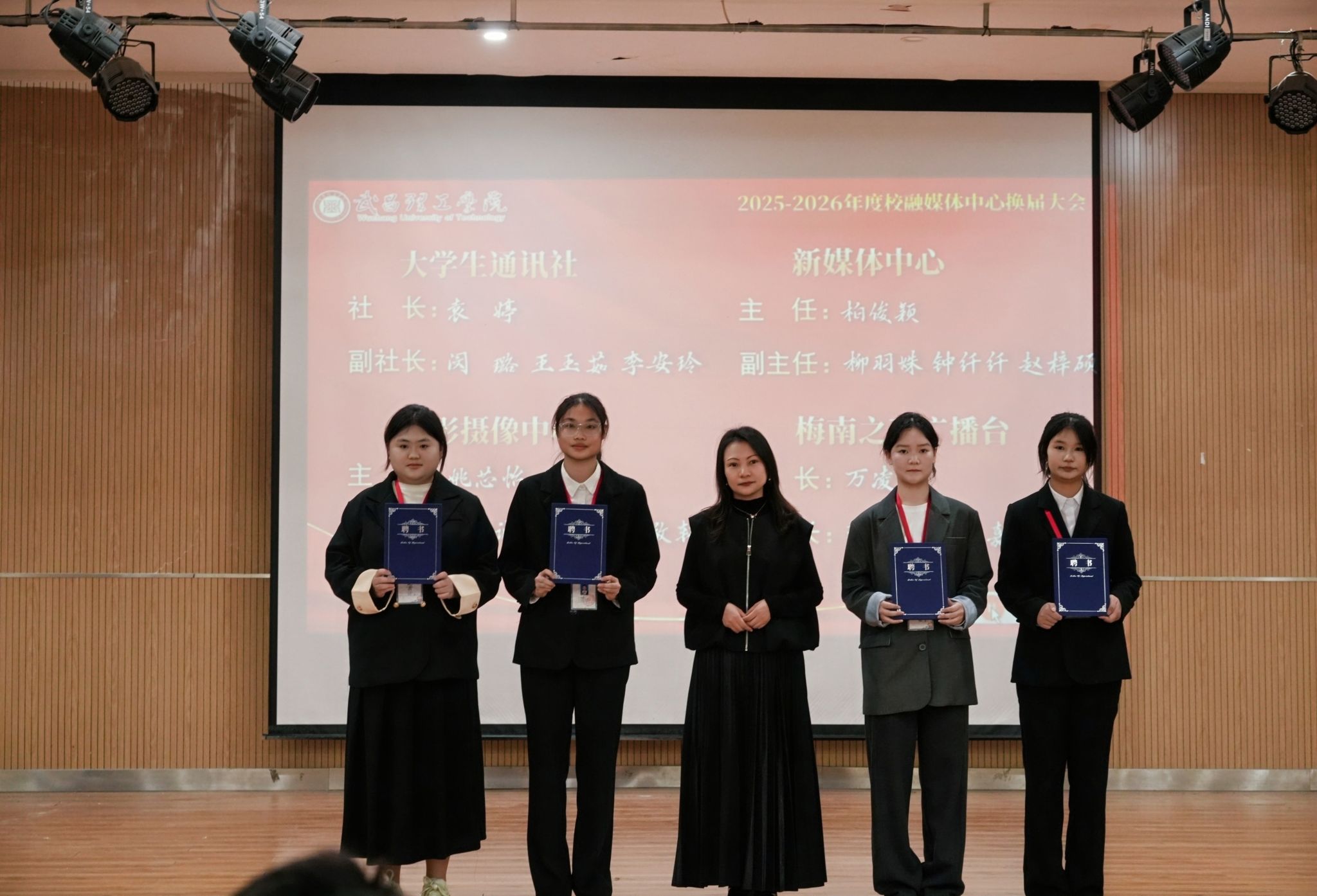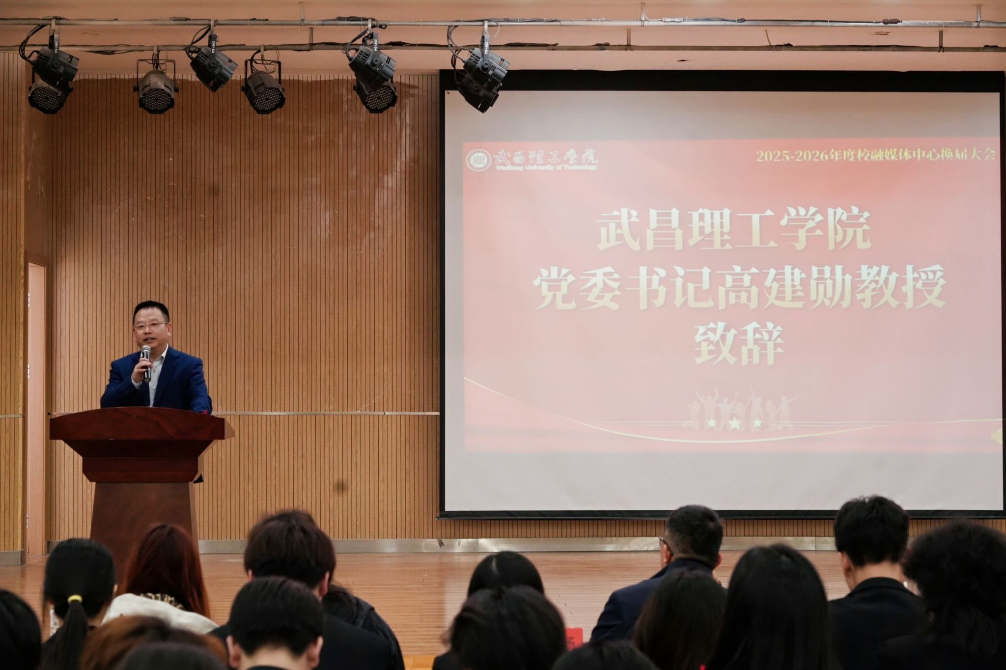 “融媒体中心下设的大学生通讯社、新媒体中心、摄影摄像中心和广播台,作为学校宣传工作的主力军,始终围绕学校发展大局,聚焦特色亮点,讲述师生典型故事。在过去的一年中,推动学校新闻宣传实现新突破、迈上新台阶,在提升学校知名度、美誉度和影响力、凝练武昌理工学院大学精神和大学文化、服务教育教学改革等方面作出了积极努力且硕果累累。”换届大会在高建勋书记的致辞中拉开序幕。他强调了高校宣传工作的重要意义,充分肯定了融媒体中心为塑造武昌理工形象、凝练武昌理工精神作出的重要贡献。同时他提出三点希望:一是牢记责任,锤炼“四力”,讲好武昌理工故事;二是自律为基,夯实功底,成长为综合型人才;三是团结协作,凝聚合力,共筑发展新篇。