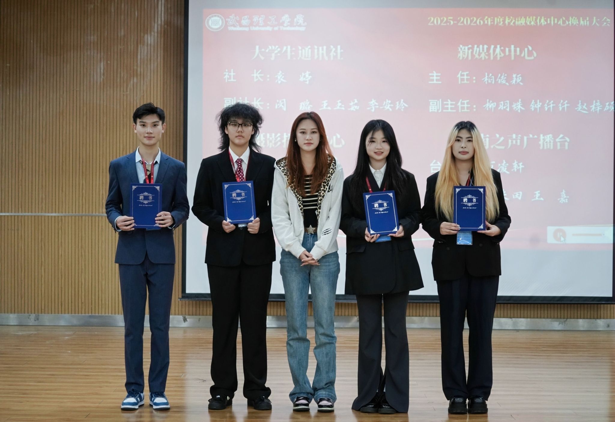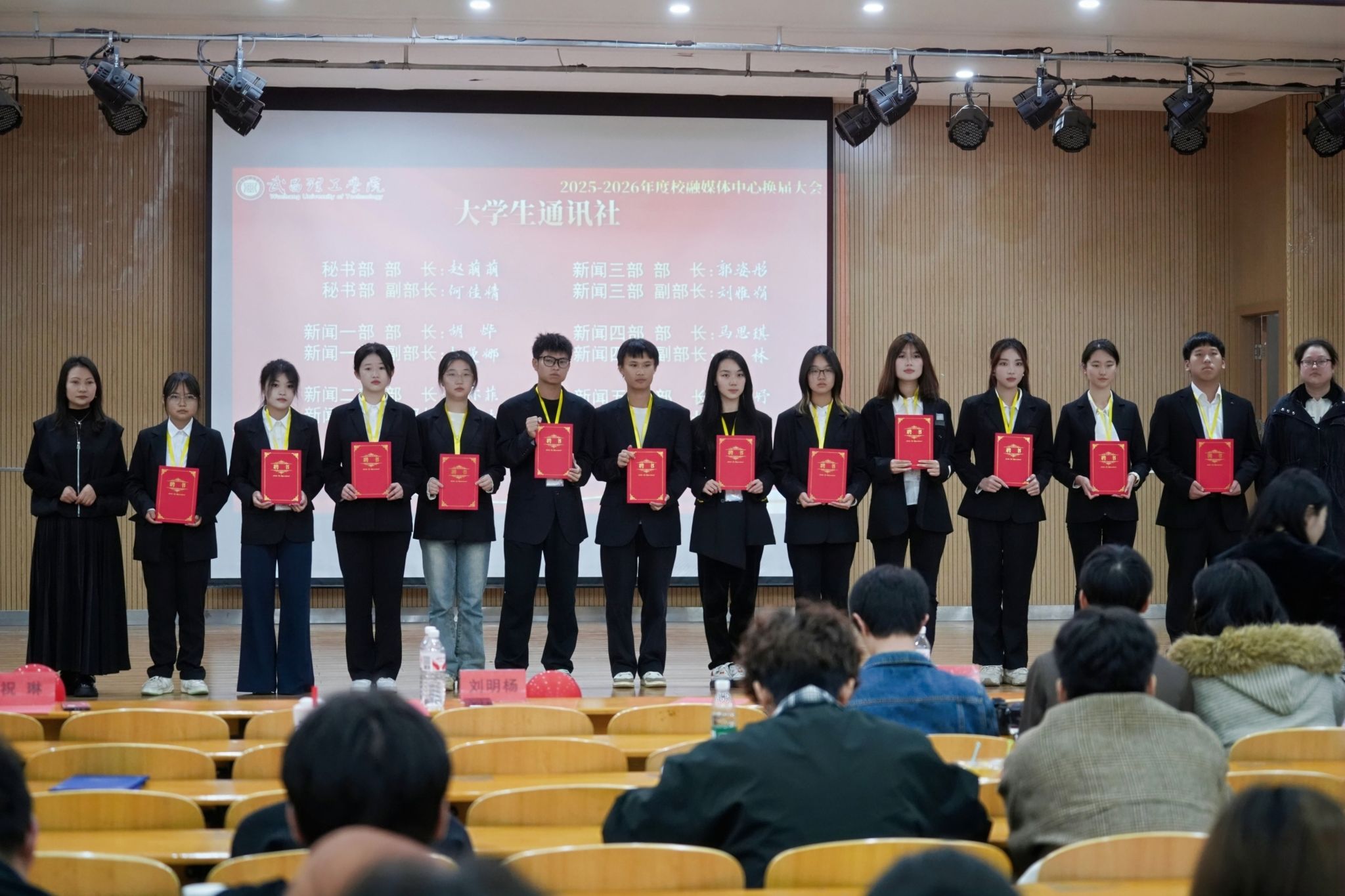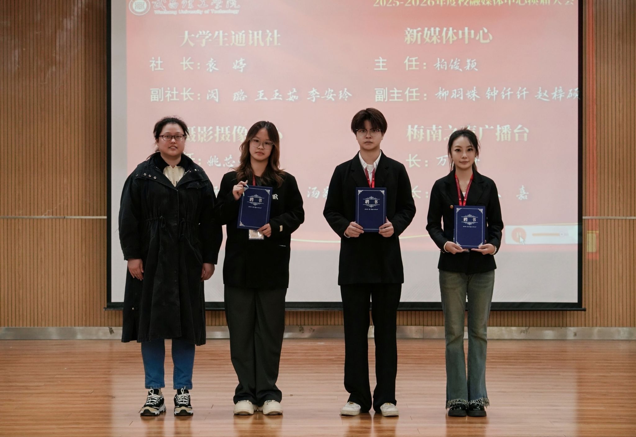 大学生通讯社社长袁婷、新媒体中心主任柏俊颖、摄影摄像中心主任姚芯怡、梅南之声广播台台长万凌轩依次上台发表任职演讲,阐述工作规划,展现创新实干的决心。