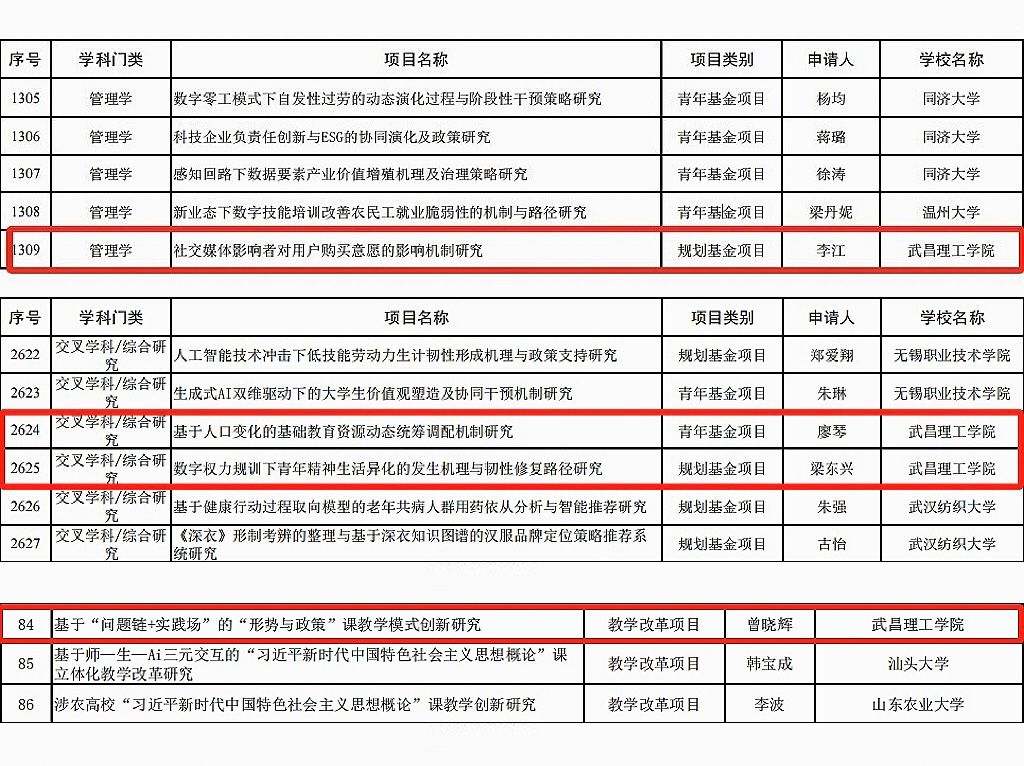 本次获批项目聚焦数字时代青年精神困境、社交媒体营销、基础教育人口适配及思政课创新等前沿议题,分别为:素质教育研究院梁东兴申报的规划基金项目《数字权力规训下青年精神生活异化的发生机理与韧性修复路径研究》、商学院李江申报的规划基金项目《社交媒体影响者对用户购买意愿的影响机制研究》、通适素质教育学院廖琴申报的青年基金项目《基于人口变化的基础教育资源动态统筹调配机制研究》,以及马克思主义学院曾晓辉申报的思政课教师专项《基于“问题链+实践场”的“形势与政策”课教学模式创新研究》。
