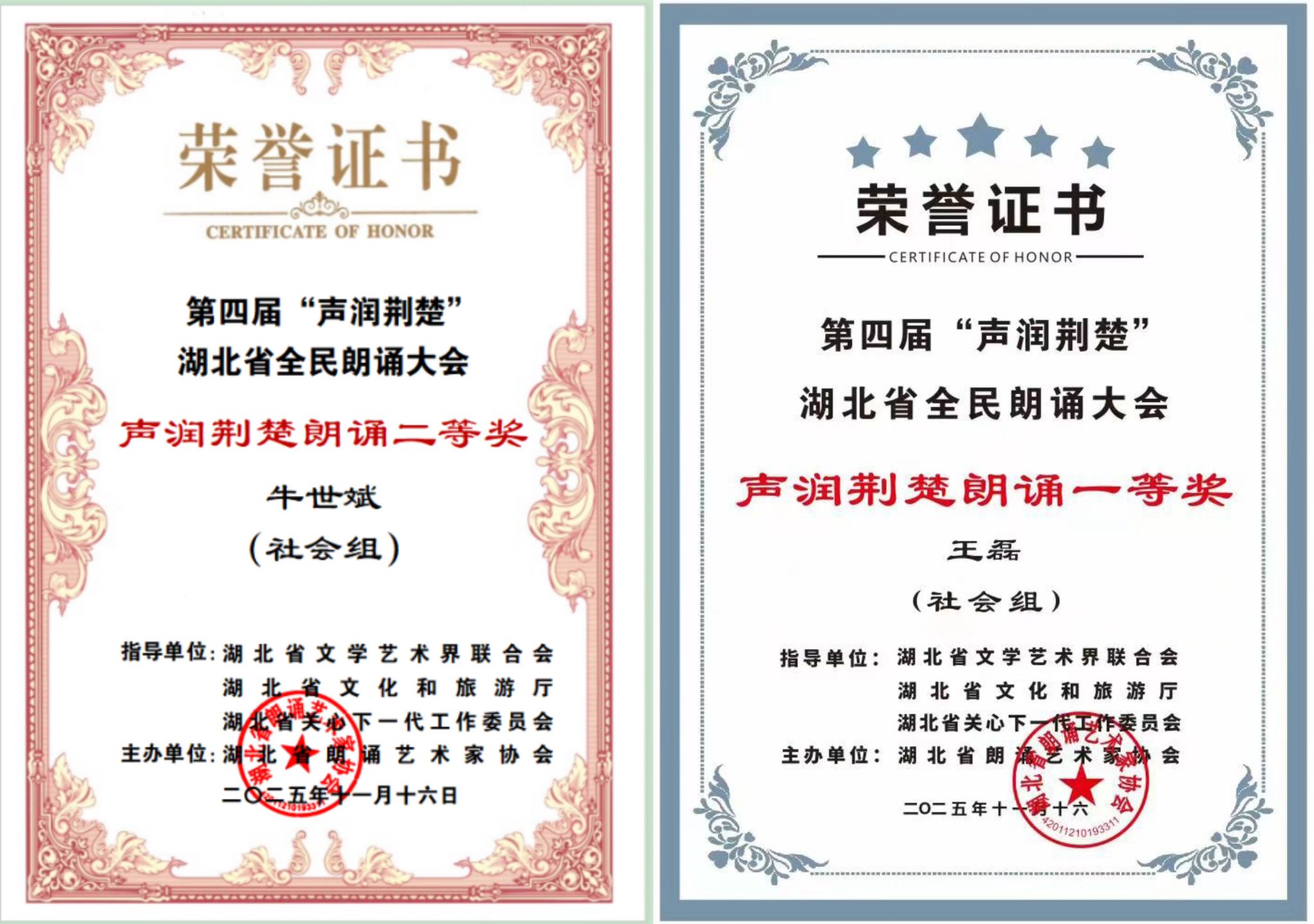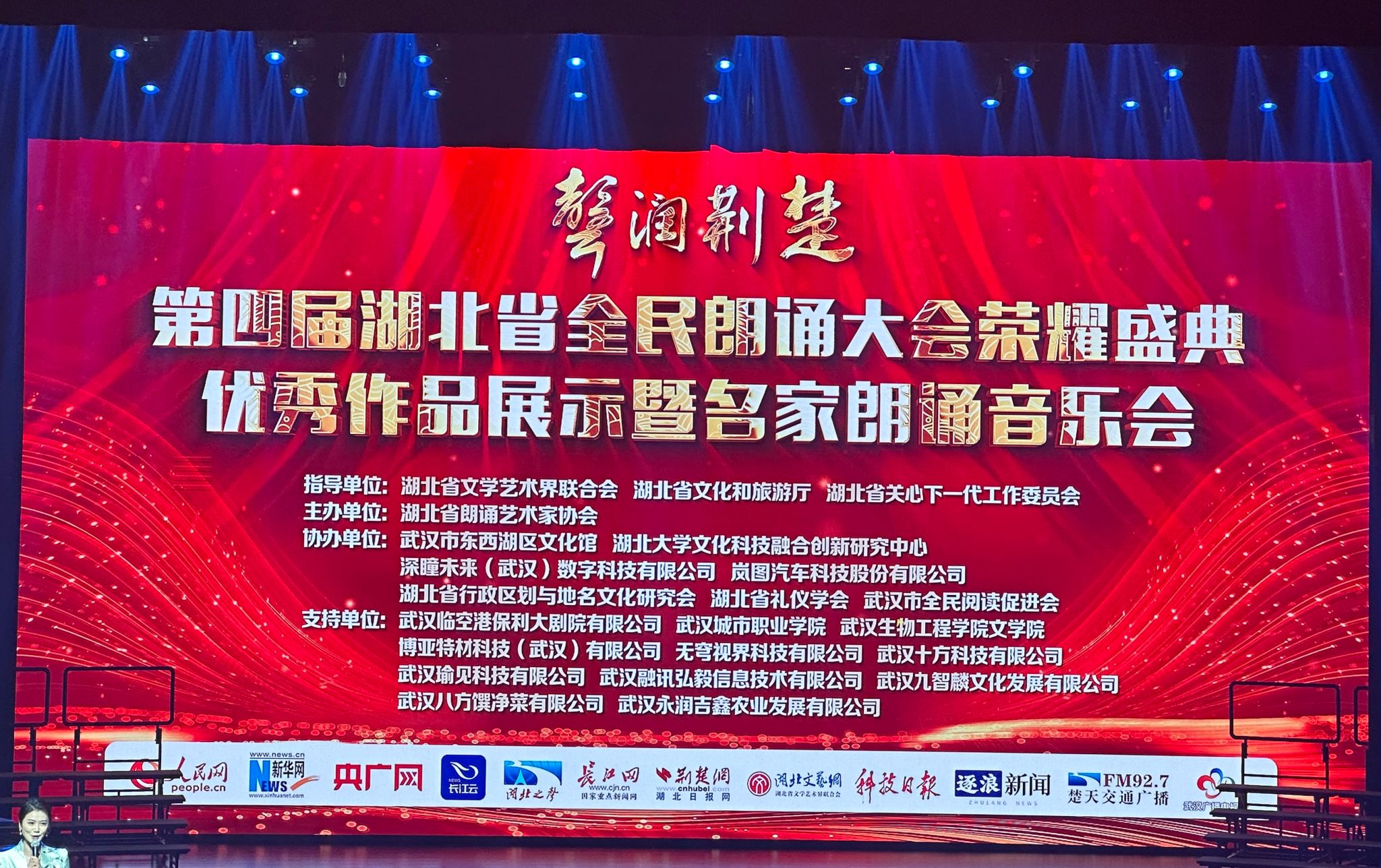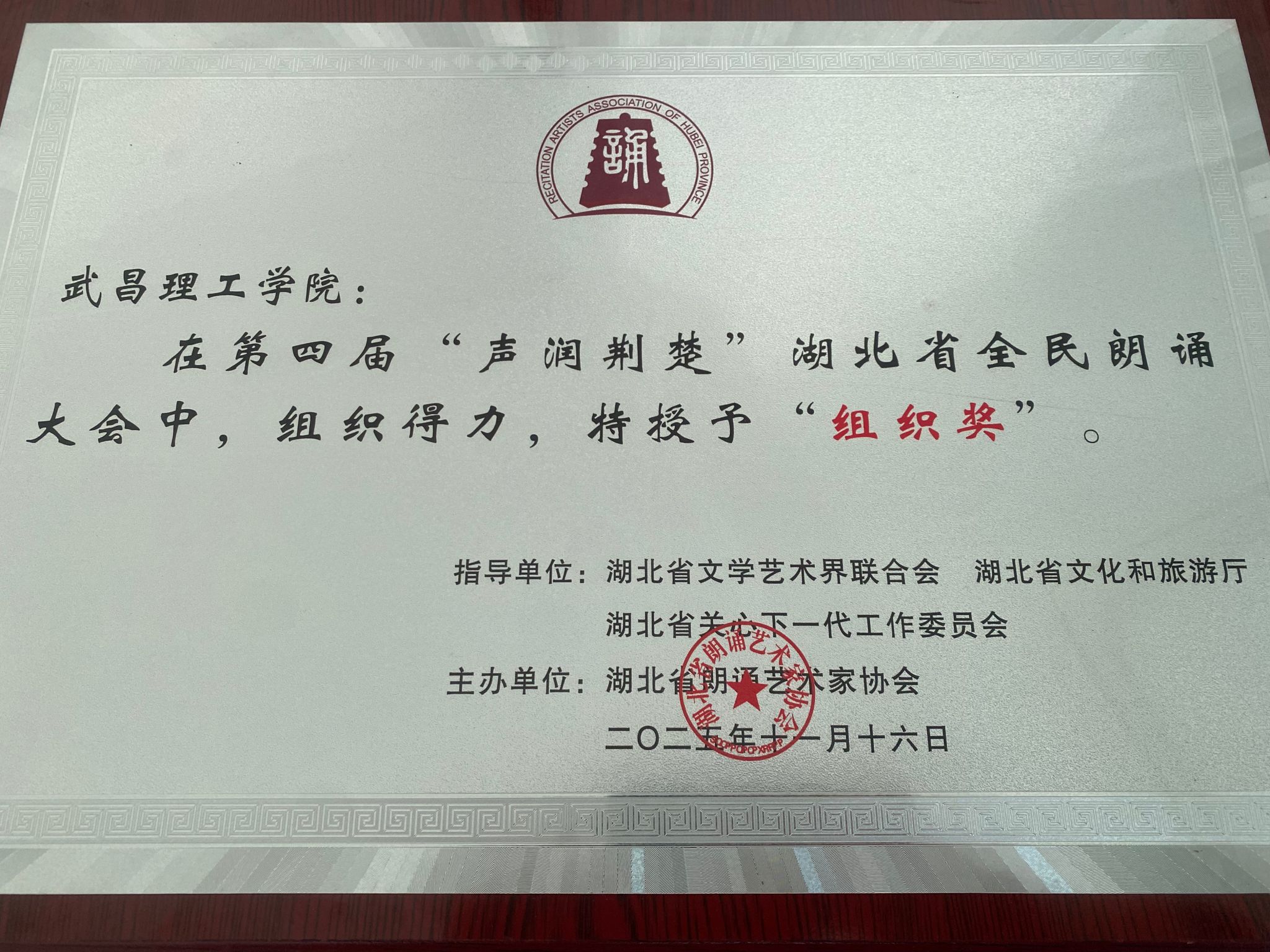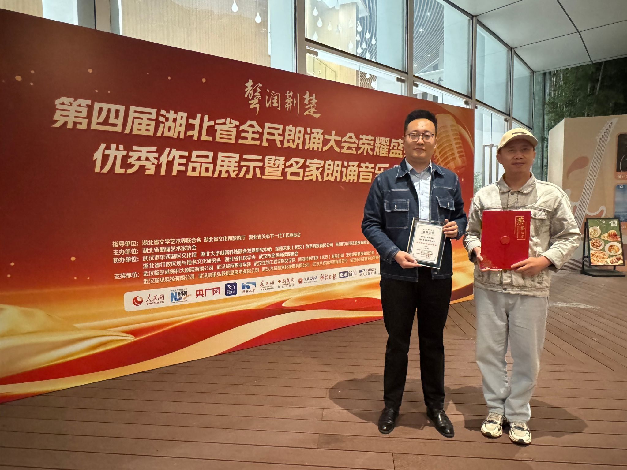 中南在线11月20日消息(记者 周黎 特约通讯员 岳舒平 报道)近日,第四届“声润荆楚”湖北省全民朗诵大会在武汉圆满落幕。武昌理工学院影视传媒学院教师王磊、牛世斌分别荣获朗诵一、二等奖,学校荣膺“优秀组织奖”。