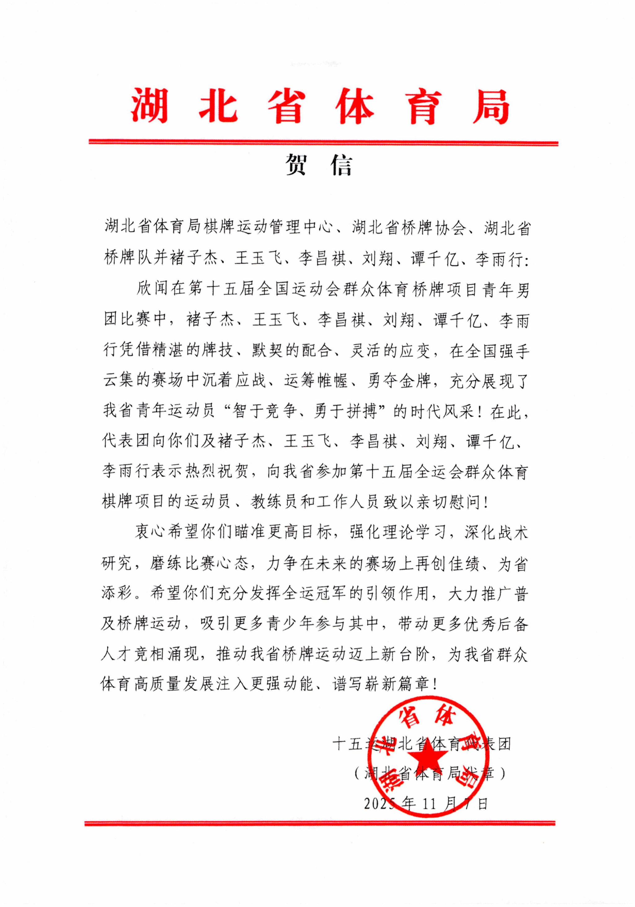 中南在线11月24日消息(记者 周黎 大通社记者 袁婷 报道)近日,从智能建造学院传来喜讯:该学院2015级校友李昌祺与队友在第十五届全国运动会上斩获桥牌青年男子团体项目金牌,为湖北代表团赢得荣誉。湖北省体育局已专程向获奖团队发贺信表示祝贺。