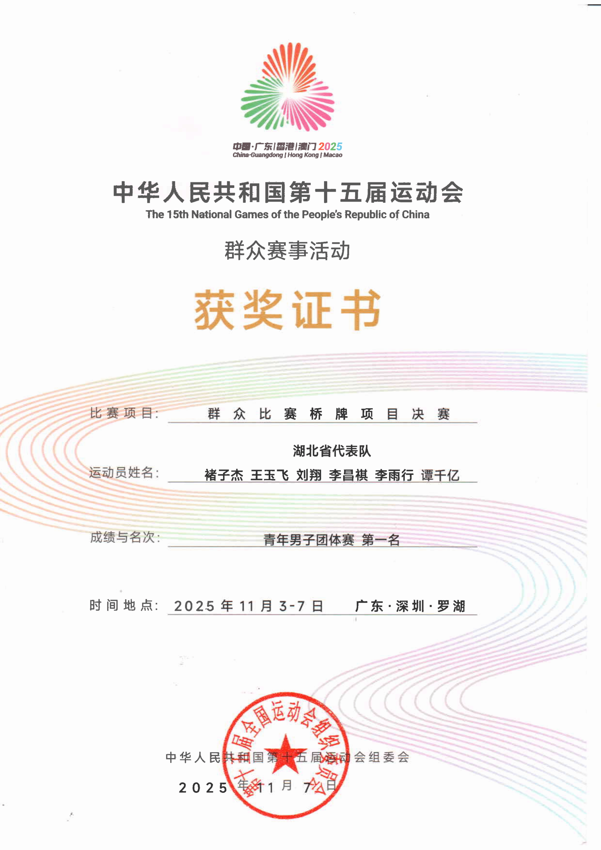 “从大学初识桥牌,到如今站上全国赛场,近十载寒暑的坚持与磨砺,是我人生中宝贵的财富。”李昌祺在赛后感慨道,“这是我桥牌青年阶段的‘终局之战’,能为自己、为湖北赢得这枚金牌,我感到无比自豪。”