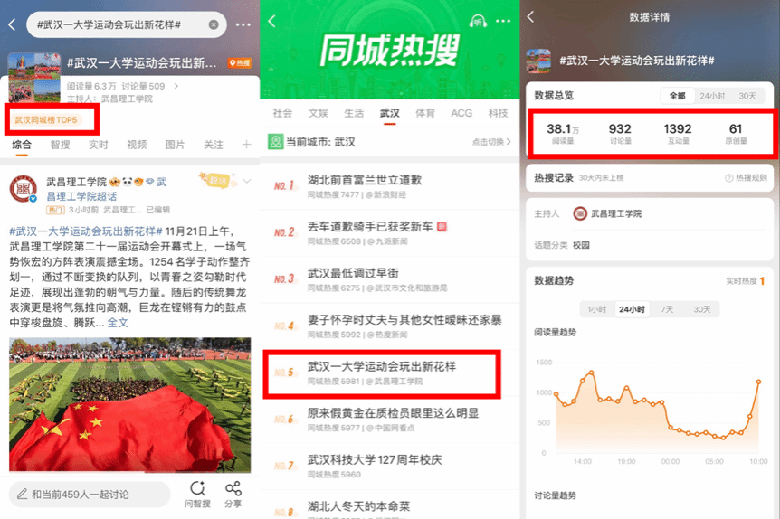 该主题新闻引发媒体广泛关注,被人民网、荆楚网、中华网、网易新闻、中国教育在线、湖北教育信息网、今日头条、百度网、新浪新闻、中国大学生在线等10余家媒体报道。学校官方微博发布的内容上榜热门微博,策划的话题#武汉一大学运动会玩出新花样#登上微博同城热搜榜第5位,并连续两天在榜,话题总阅读量超38万次,讨论量近1千人次,互动量达1.4千次,被武汉校园、中国大学生在线等微博大V转发互动,引发广泛讨论。宣传处制作的系列短视频取得良好传播效果,系列视频总播放量近13万次。开幕式通过抖音与视频号双平台同步直播,观看人次达2.5万,点赞量突破7万。运动会通过喔图进行图片行直播,总浏览量高达29万次。运动会的全网总曝光量近百万次。
