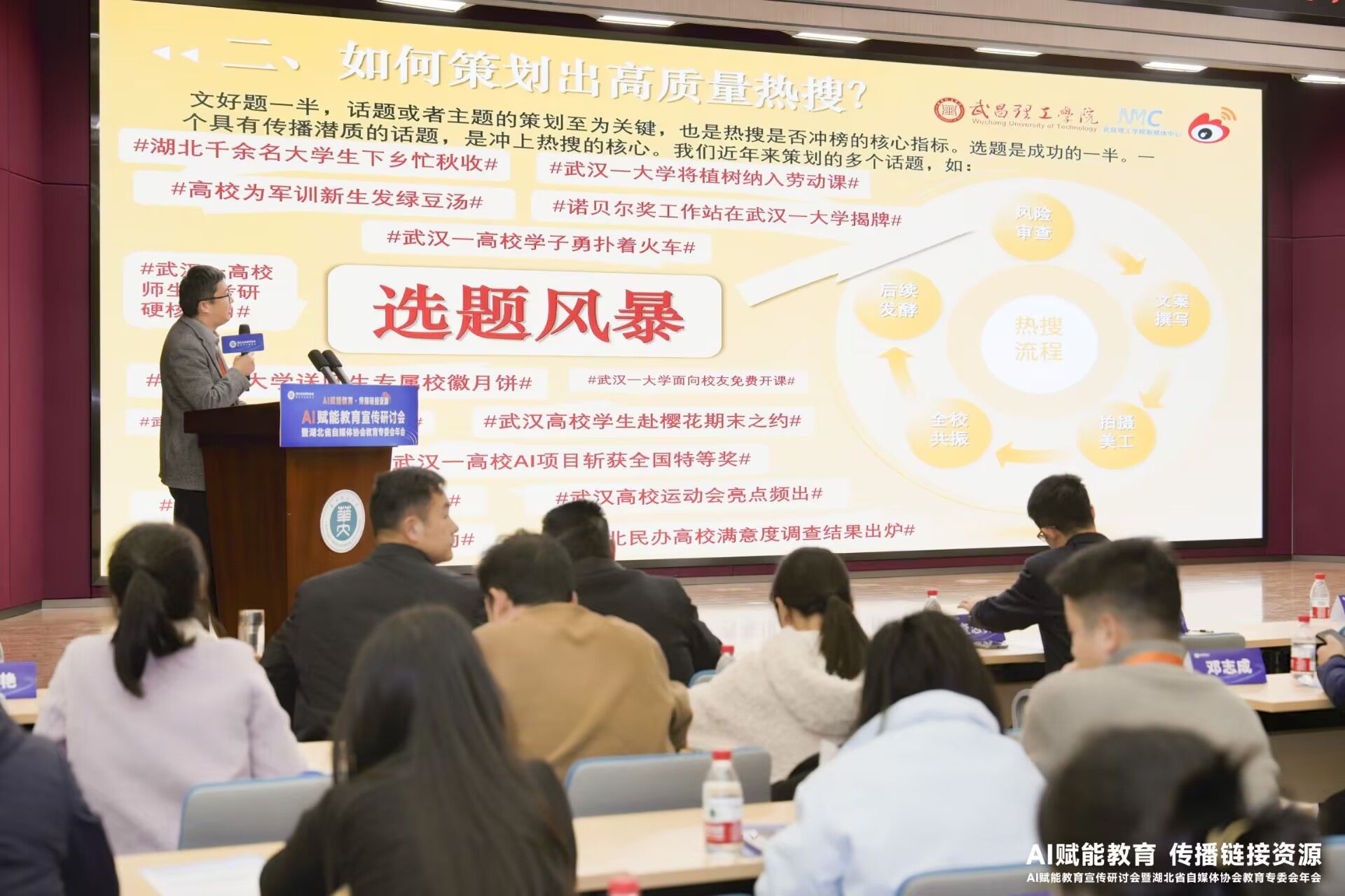 经验分享环节中,武昌理工学院与武汉大学、中国地质大学(武汉)、湖北大学等高校代表,从实践角度探讨了AI助力网络传播、IP打造与内容革新的具体路径。校党委宣传部负责人刘明杨以《武昌理工学院一年超十个热搜背后的故事》为题,结合学校的实践,向与会者系统汇报了学校在热搜策划、新闻传播等方面的的探索与展望。刘明杨表示,媒体的持续关注,既提升了学校的知名度与美誉度,也向社会传递了积极向上的价值观,展现了我校的办学成果与发展活力,为学校改革发展营造了良好的舆论氛围。经验分享引发会场热烈反响和广泛好评。在圆桌论坛环节,刘明杨还就“自媒体平台如何赋能教育行业发展”交流了自己的思考和观念。