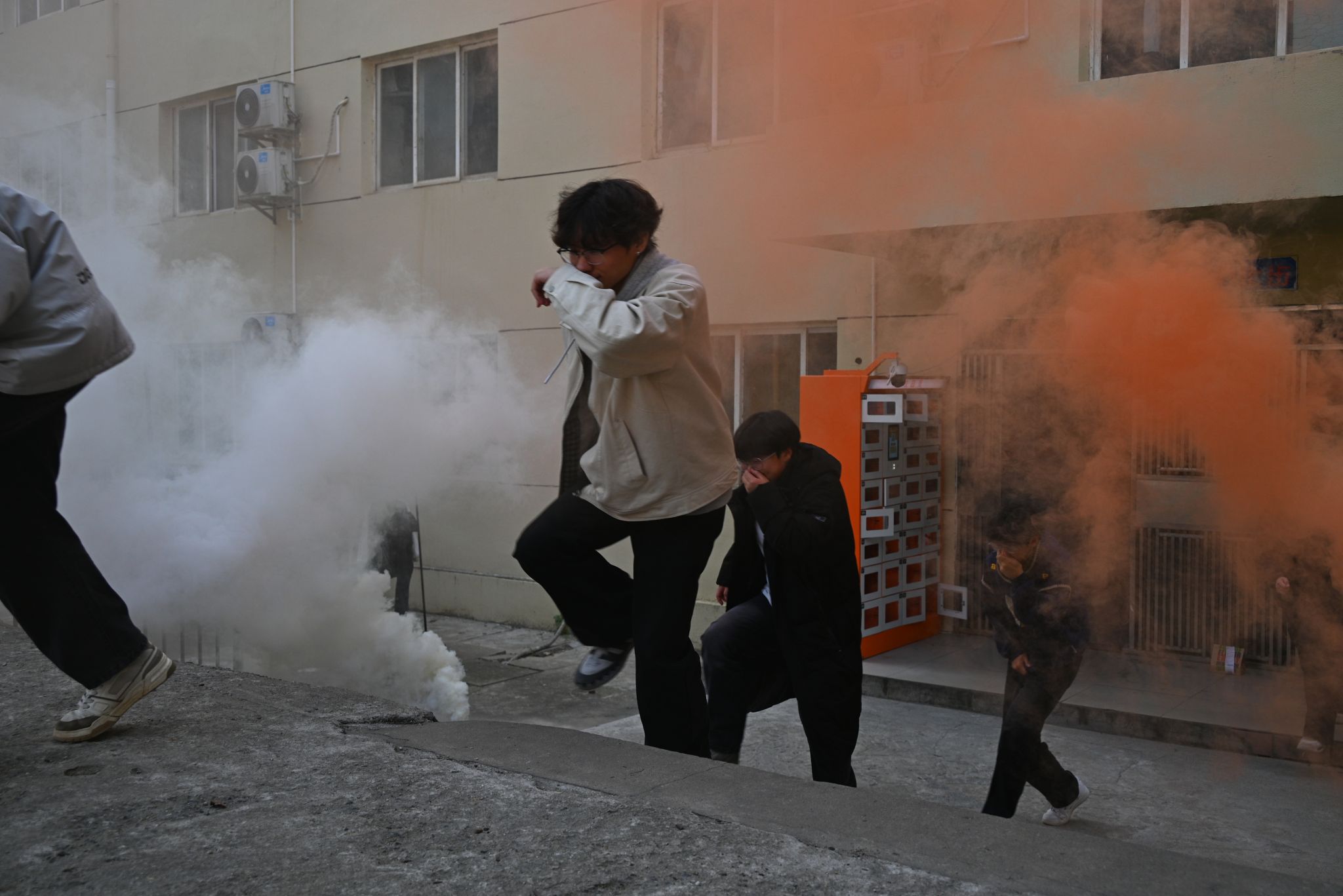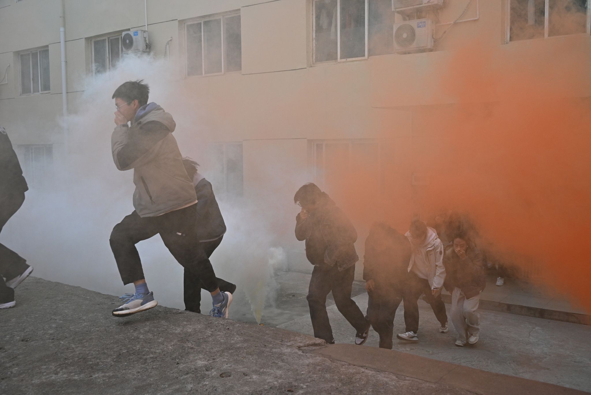 本次演练聚焦秋冬季火灾防控特点,采取“理论讲解+实战操作”相结合的模式,涵盖疏散逃生、灭火实操、违规电器销毁、救护演练等多环节内容。演练模拟西四学生宿舍因违规电器使用引发“火情”,随着警报响起,消防疏散演练正式启动。各楼层长与学生干部迅速响应,组织引导学生用湿毛巾捂住口鼻,弯腰低姿,沿预定路线有序撤离。整个过程紧张而不慌乱,数百名参与学生在短时间内全部安全转移至指定集结区域。