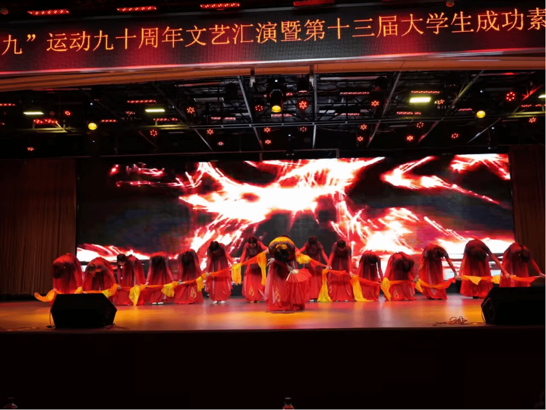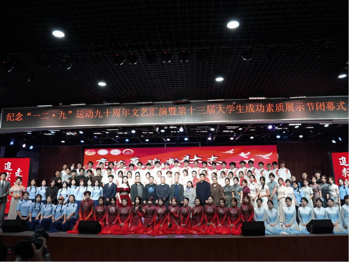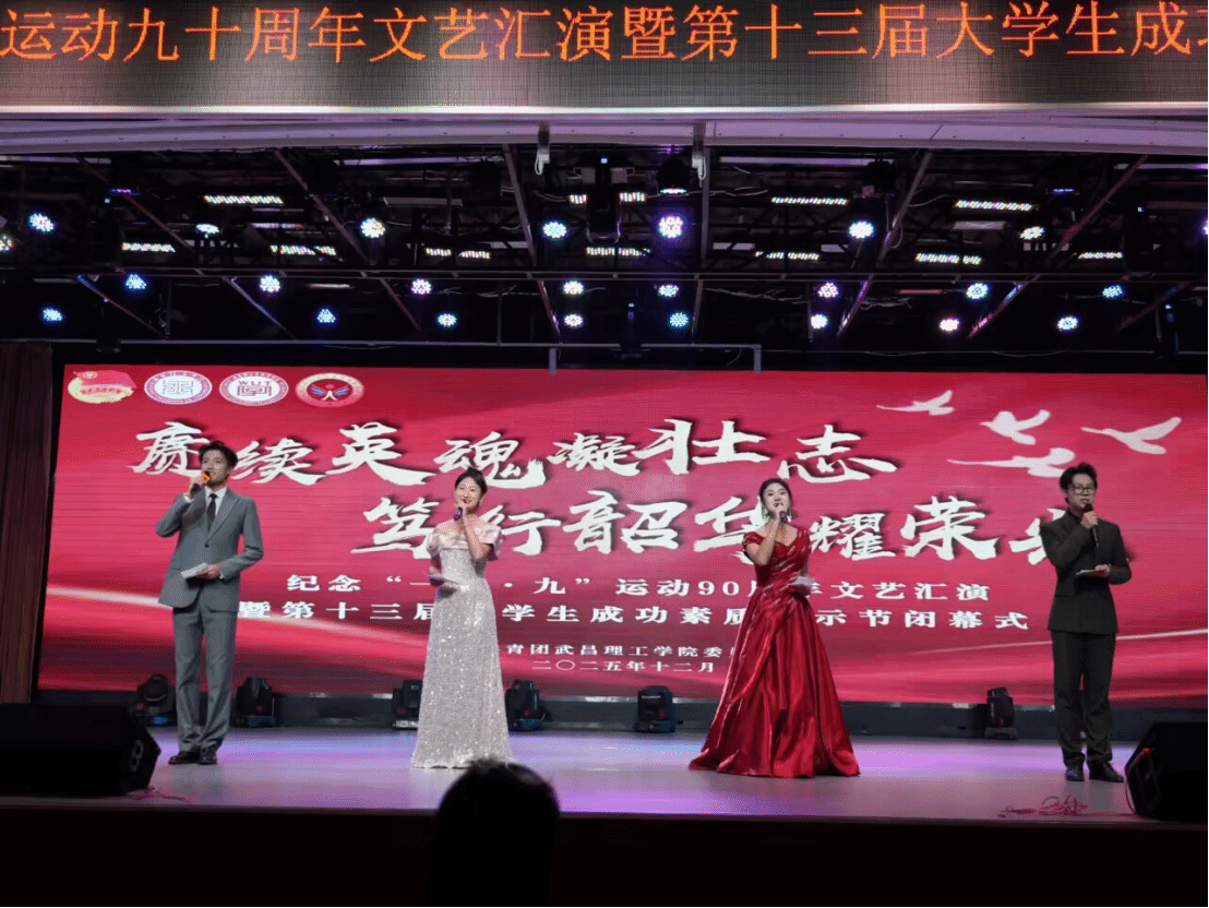 中南在线12月12日消息(大通社见习记者 梁馨仪 大通社记者 郭姿彤 闵璐 报道 摄影摄像中心 刘丽灿 陈星雨 陈禹 张欣媛 拍摄)为纪念“一二·九”运动90周年,弘扬爱国主义精神,集中展示学校素质教育成果,武昌理工学院于12月9日晚在梅南礼堂隆重举行“赓续英魂迎壮志,笃行韶华耀荣光”纪念“一二·九”运动文艺汇演暨第十三届大学生成功素质展示节闭幕式。校长助理、学工部部长李金永以及各学院党总支书记、团委书记、素质导师代表与千余名学子齐聚一堂,共赏这场融红色传承与青春风采于一体的文艺汇演。